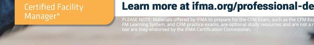 membership participates in focused component groups equipped to address their unique situations by region (142 chapters), industry (16 councils) and areas of interest (six communities). Together they manage more than 78 billion square feet of property and annually purchase more than US$526 billion in products and services. Formed in 1980, IFMA certifies professionals in facility management, conducts research, provides educational programs and produces World Workplace, the world’s largest series of facility management conferences and expositions. For more information, visit www.ifma.org.
