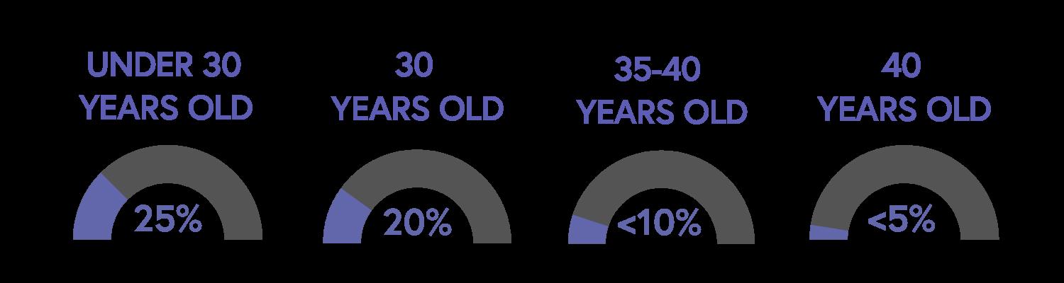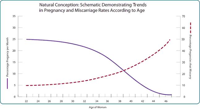 In the mid-30s, the decline accelerates until around the age of 45 when there is nearly a 0% chance of conception.