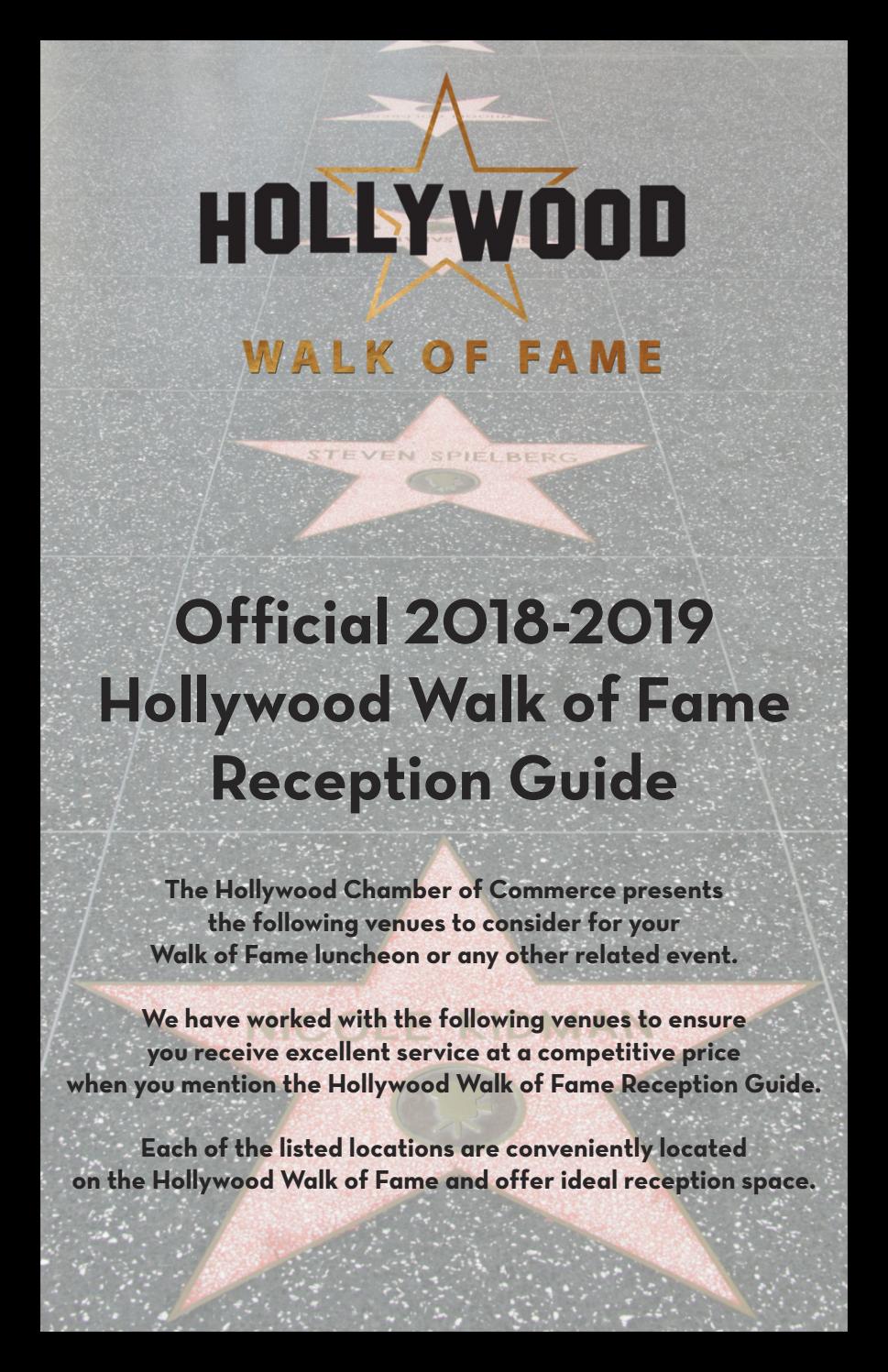 Official 2018-2019 Hollywood Walk of Fame Reception Guide The Hollywood Chamber of Commerce presents the following venues to consider for your Walk of Fame luncheon or any other related event. We have worked with the following venues to ensure you receive excellent service at a competitive price when you mention the Hollywood Walk of Fame Reception Guide. Each of the listed locations are conveniently located on the Hollywood Walk of Fame and offer ideal reception space.