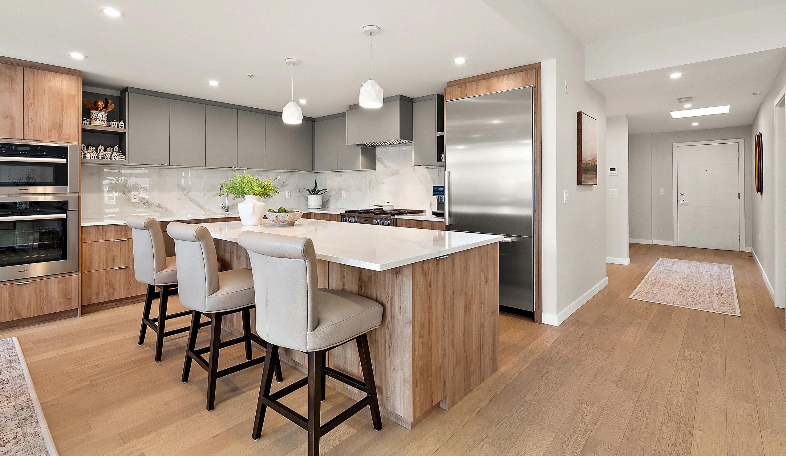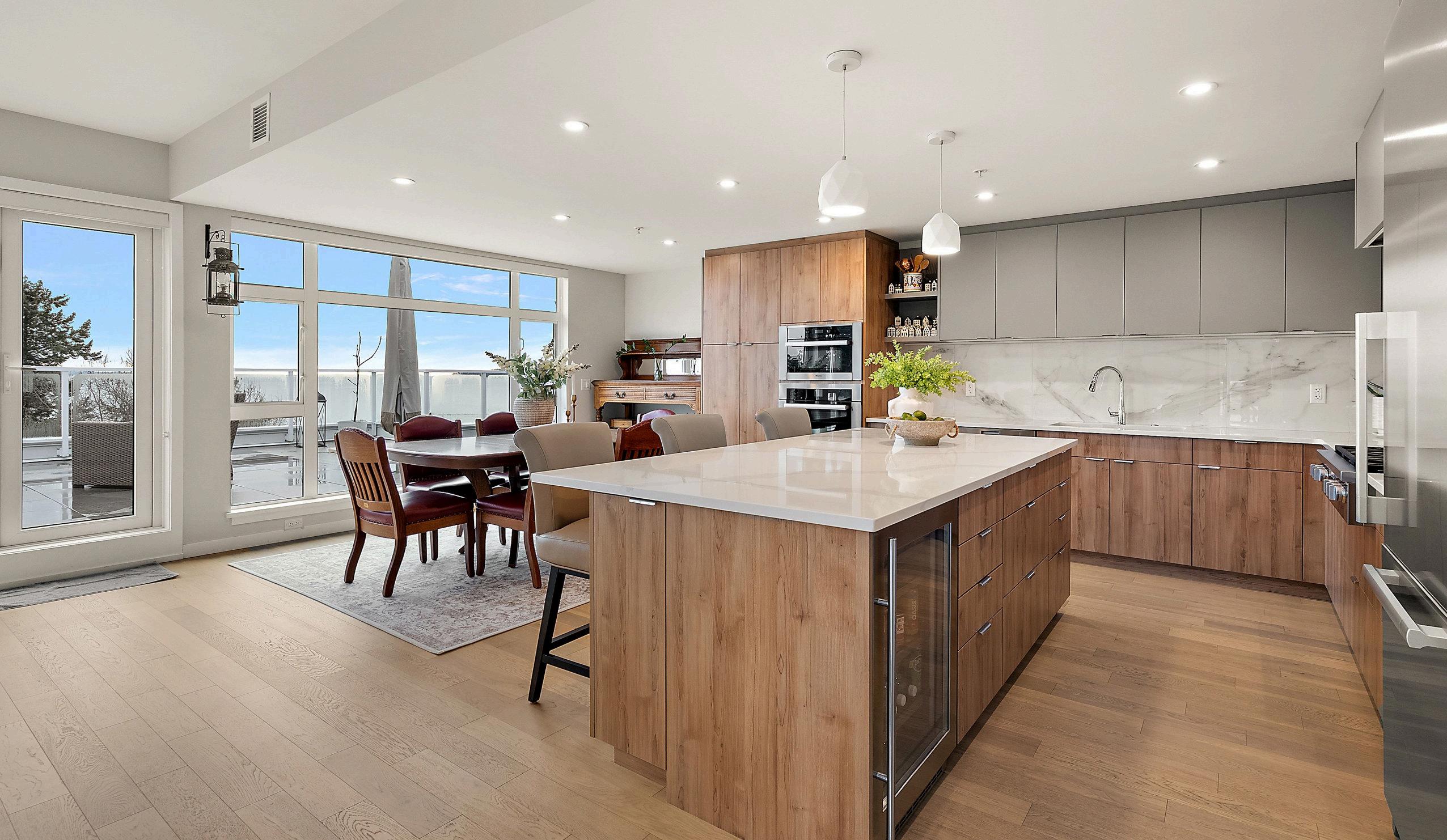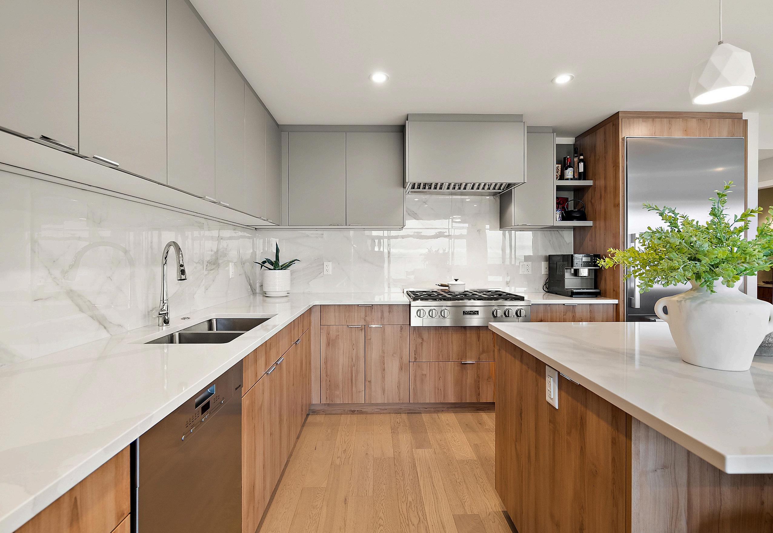 From the designer finishes to the chef-inspired kitchen and spa-like bathrooms, every detail reflects quality and sophistication. Warm light wood tones, natural veined tile, bright accents, and generous proportions create an inviting yet elegant atmosphere throughout.