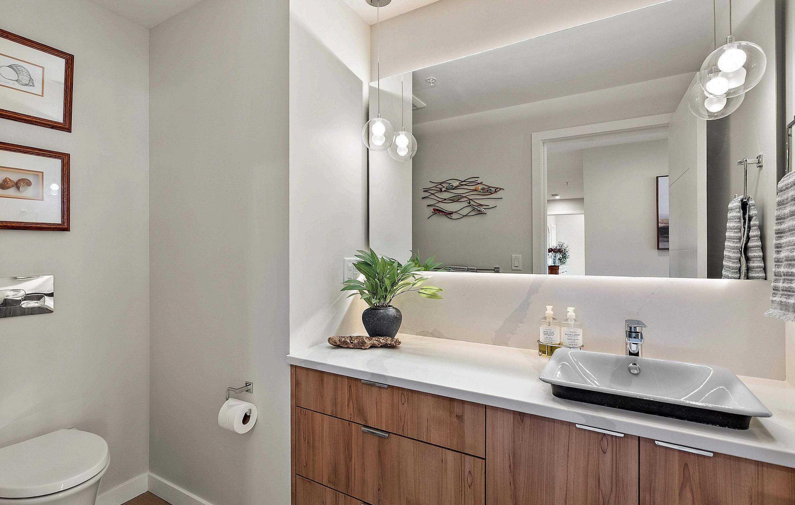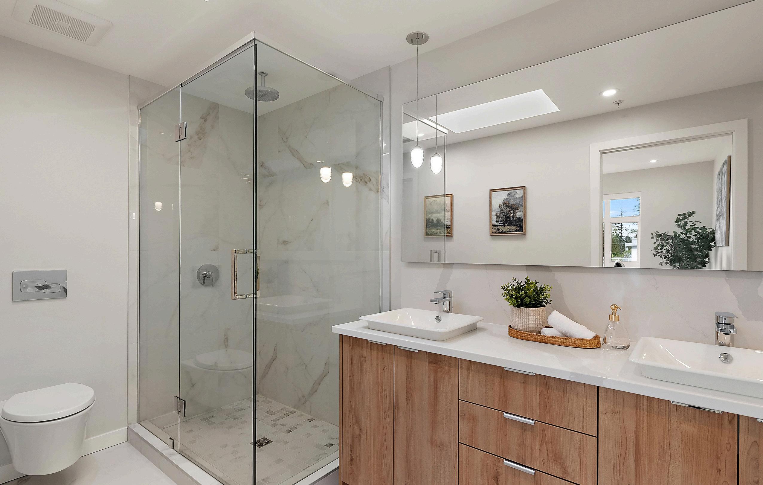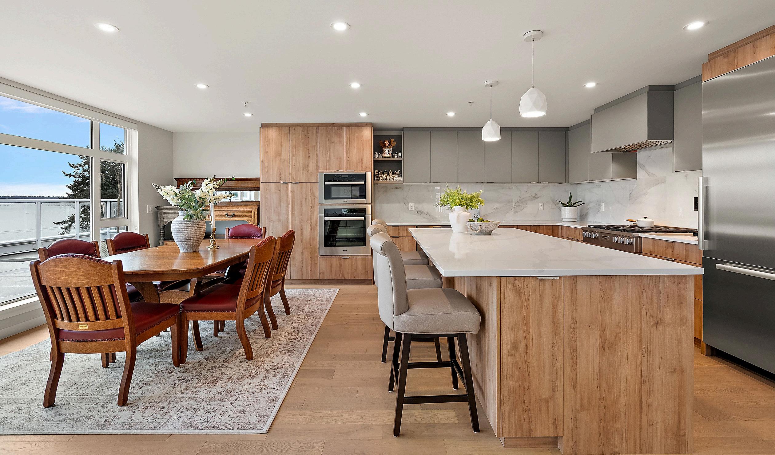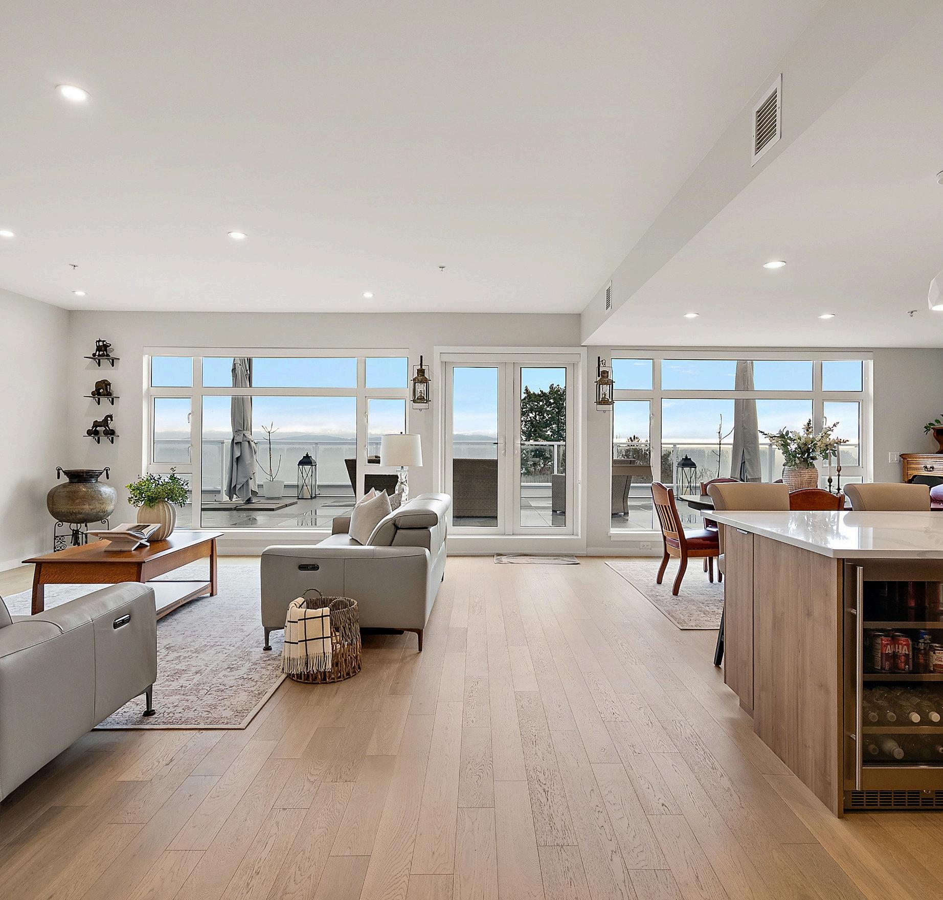 From the designer finishes to the chef-inspired kitchen and spa-like bathrooms, every detail reflects quality and sophistication. Warm light wood tones, natural veined tile, bright accents, and generous proportions create an inviting yet elegant atmosphere throughout.