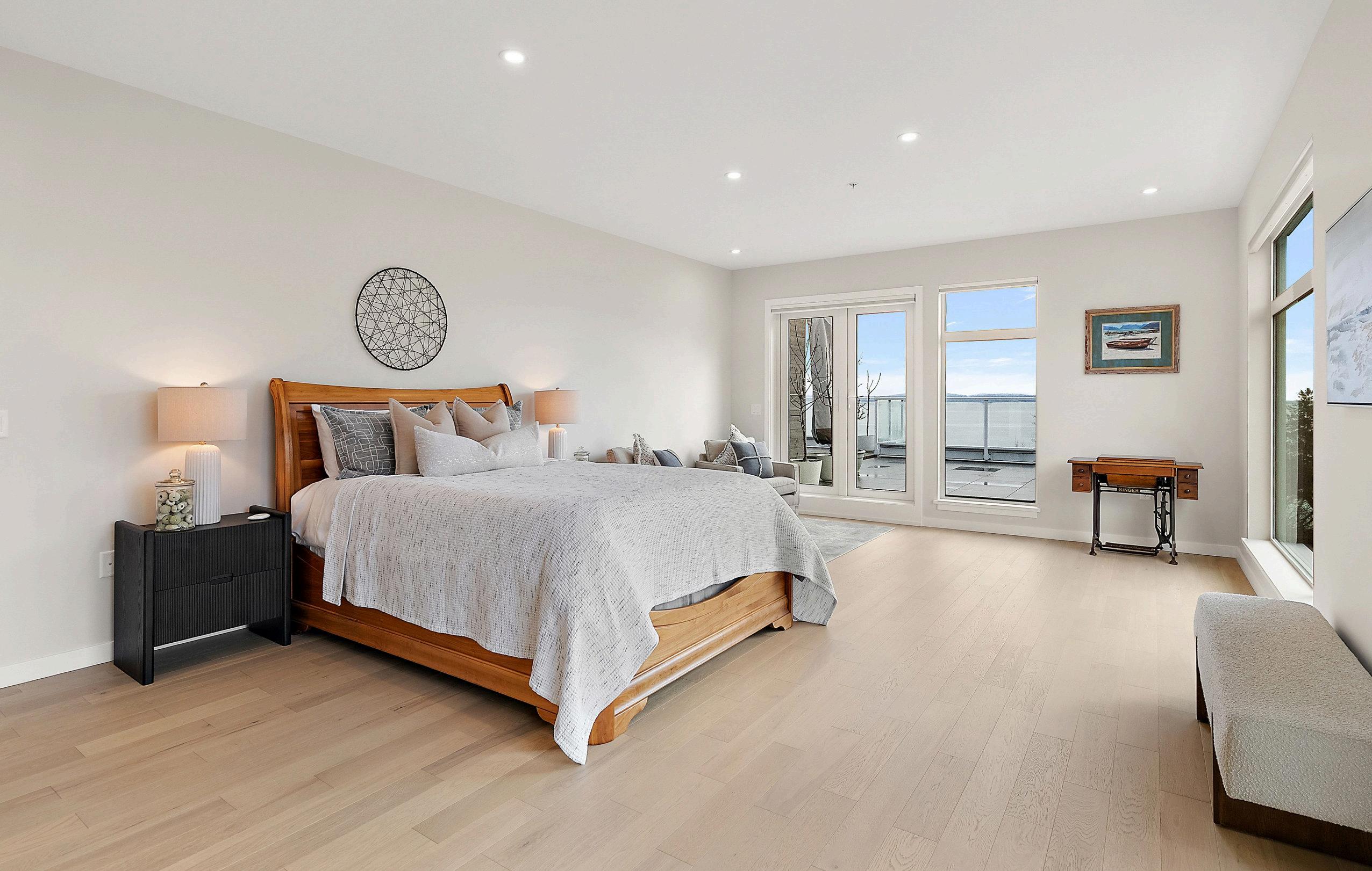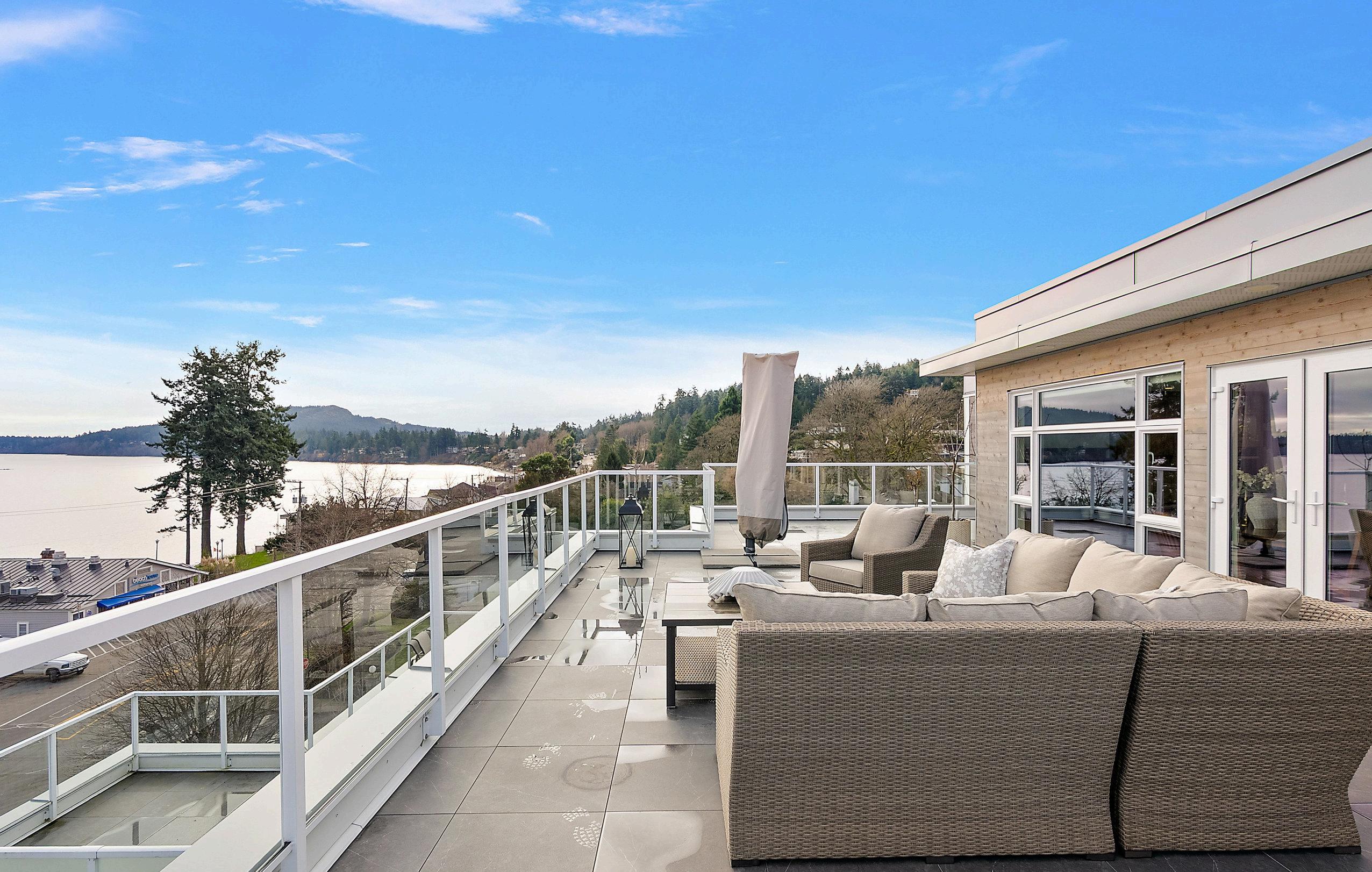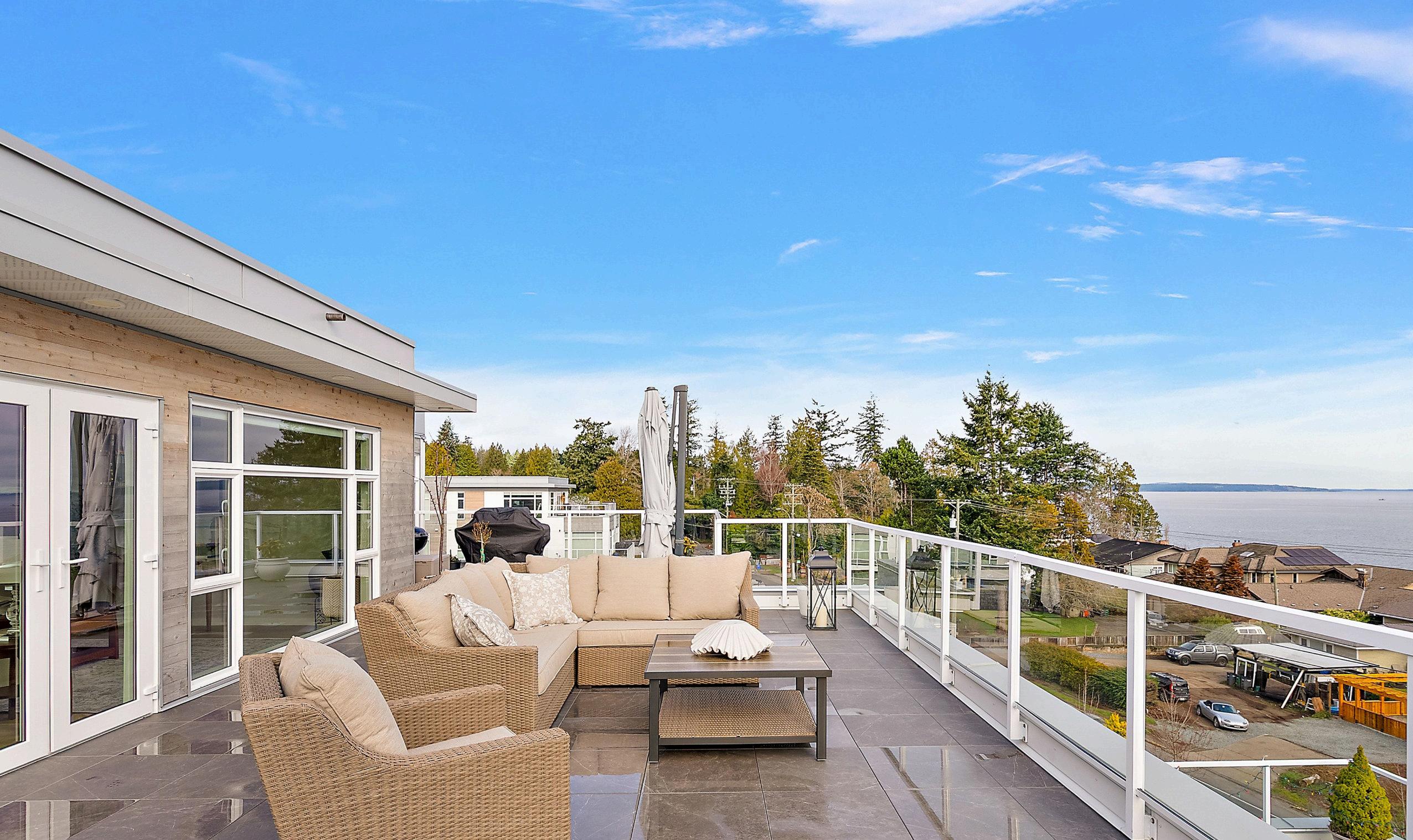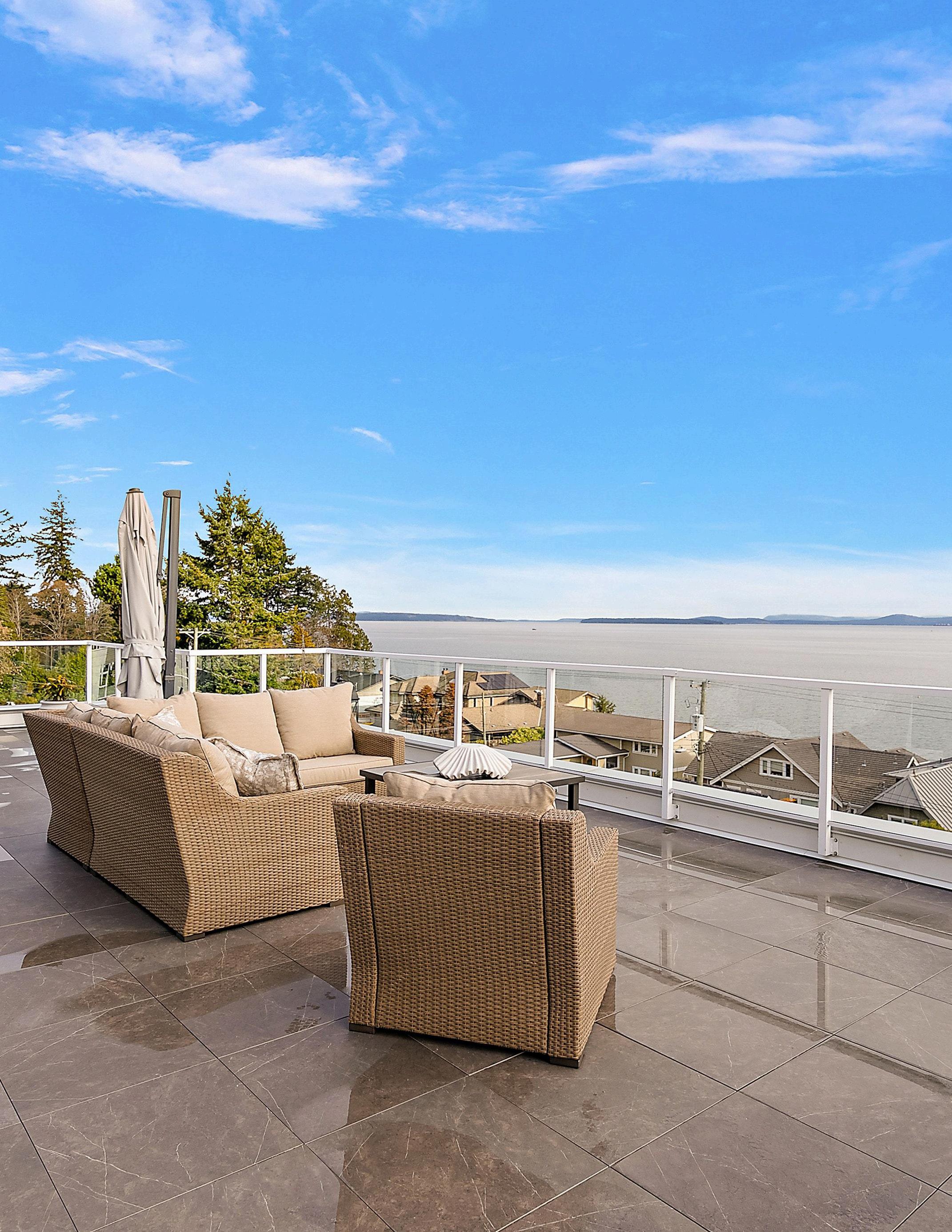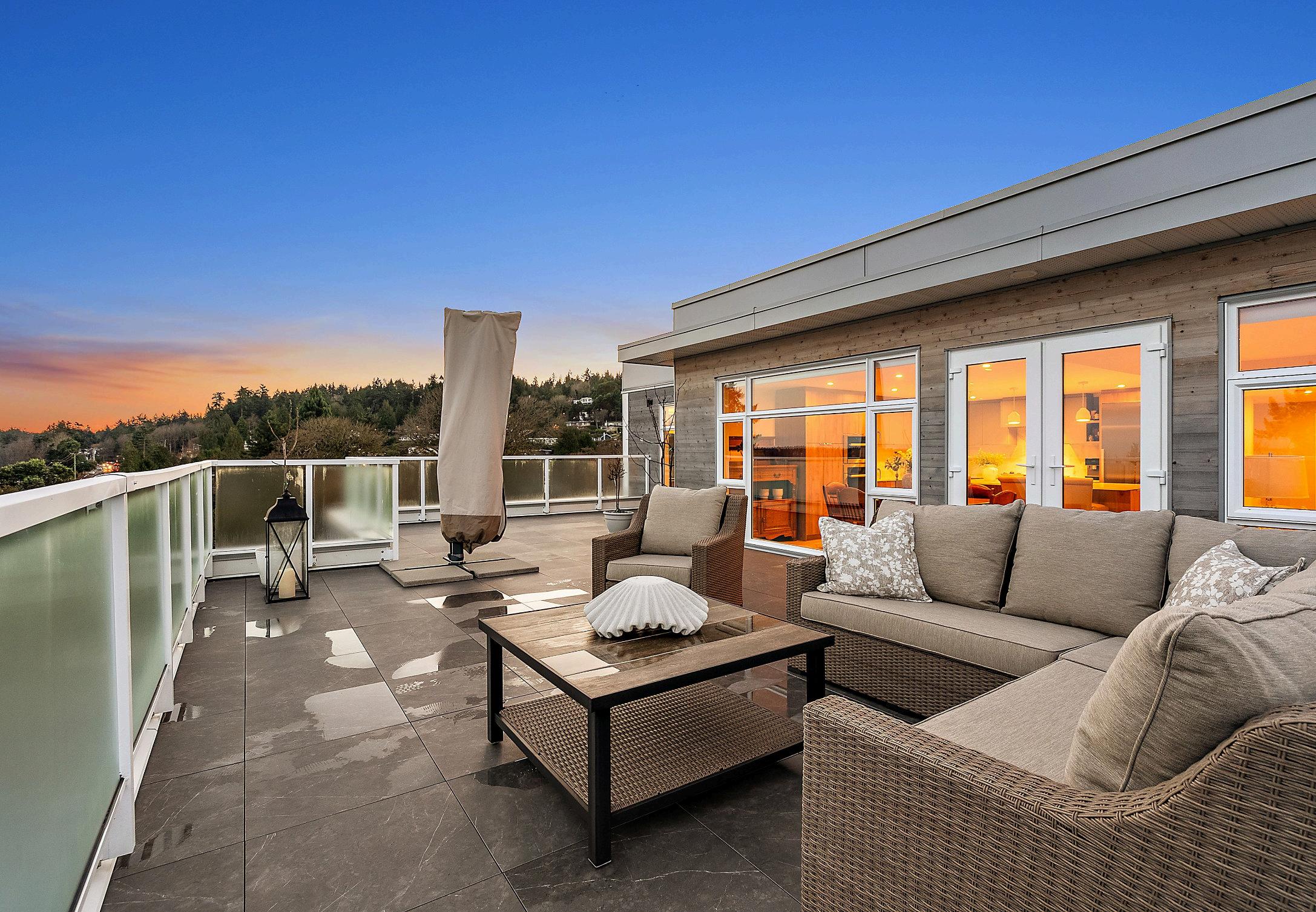 Step outside to the expansive 1,100 sq. ft. terrace and take in spectacular 270-degree views stretching from Cordova Bay’s sandy beaches to the snow-capped peaks of Mount Baker and beyond — a truly remarkable outdoor retreat.