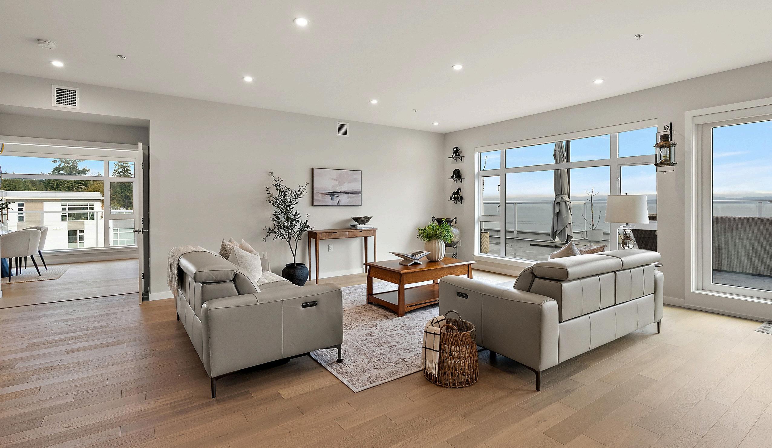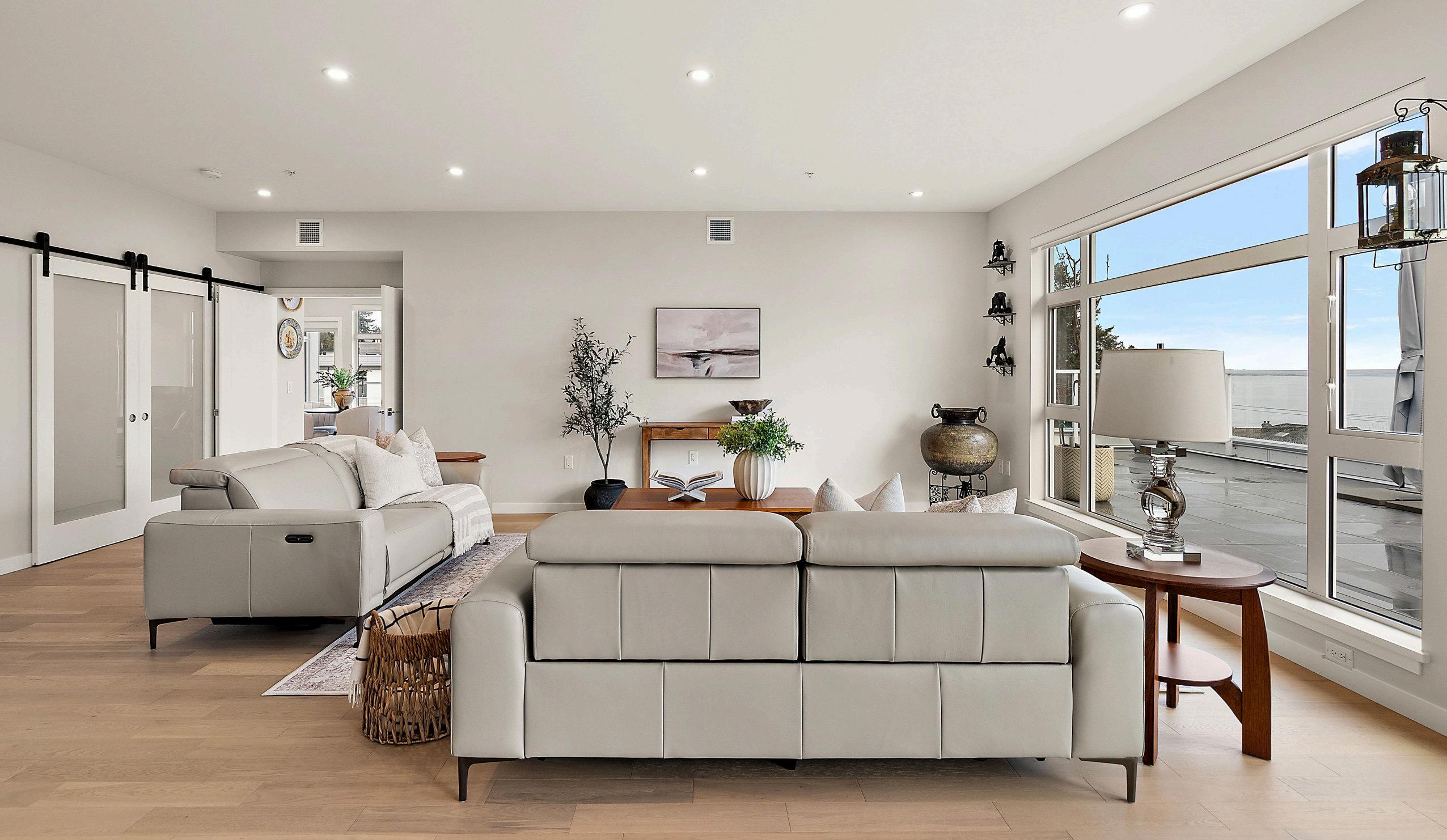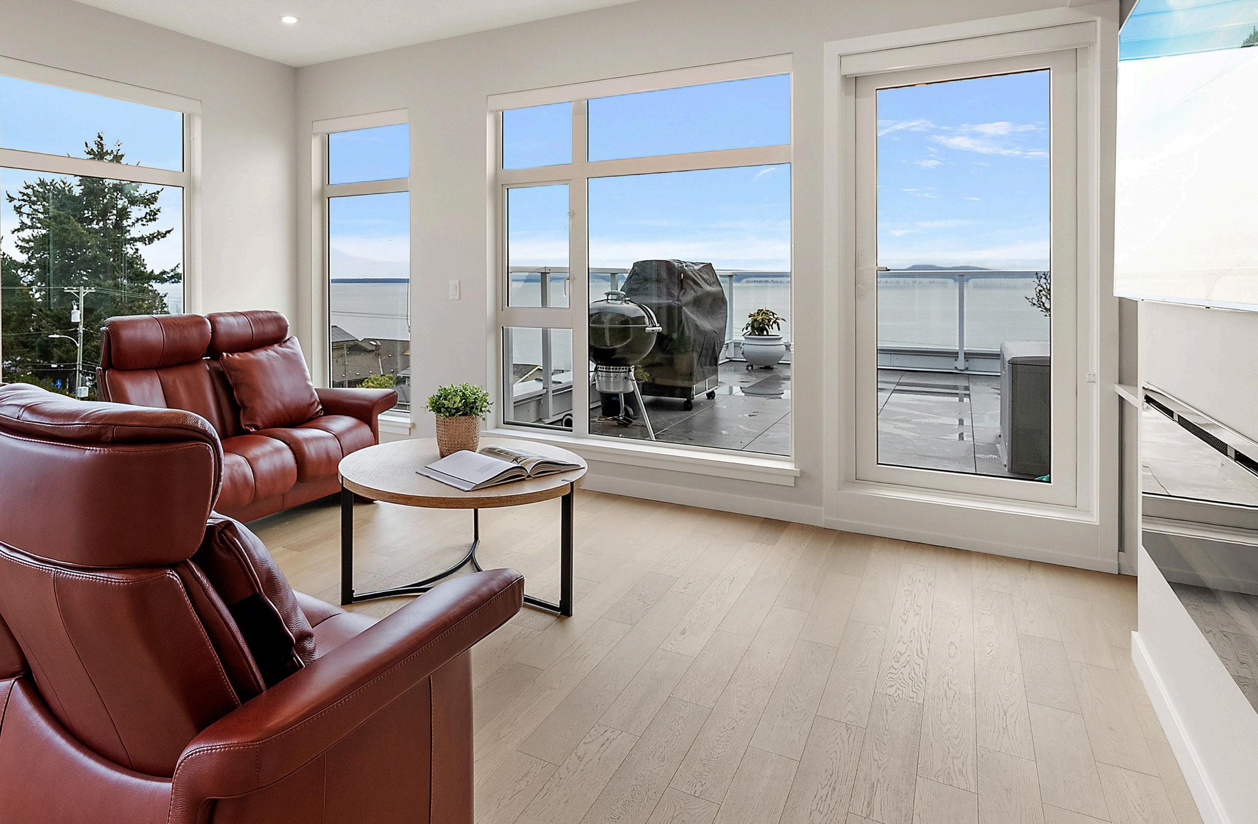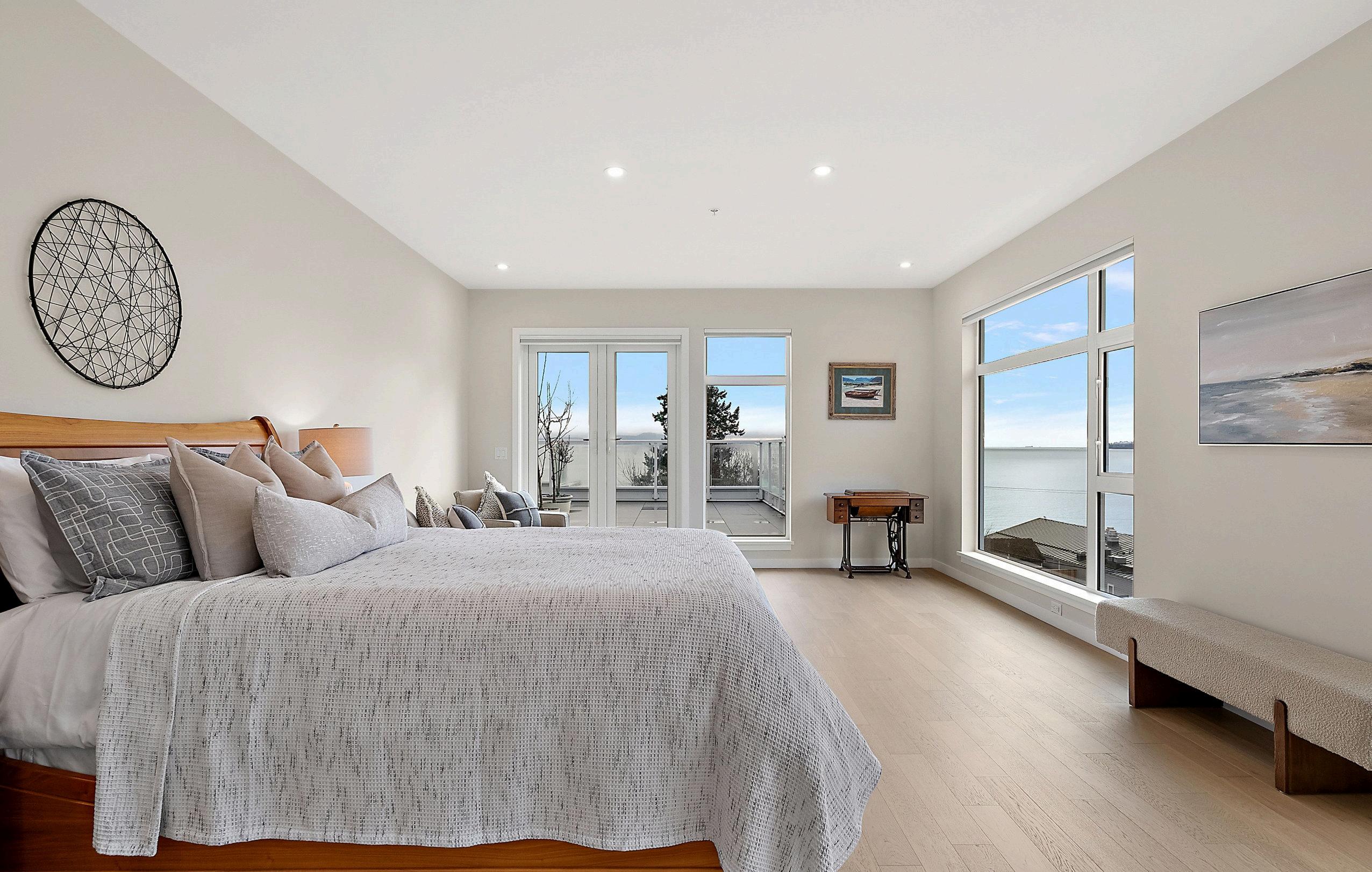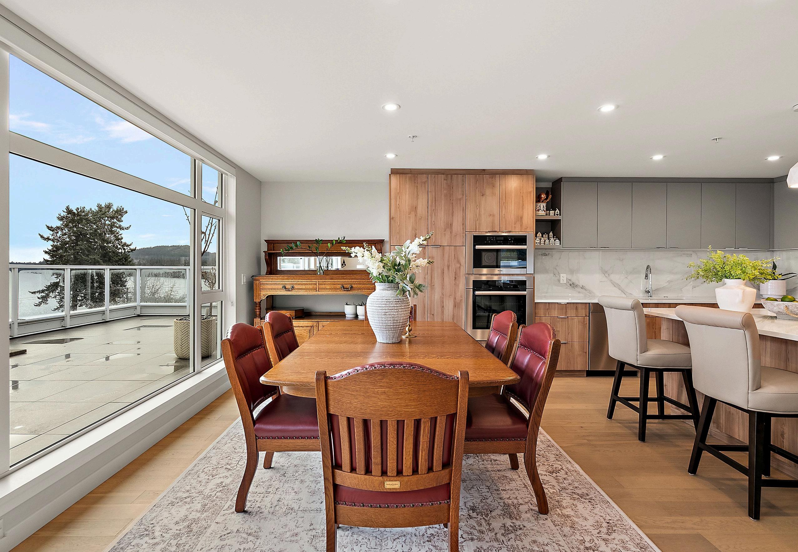 Step outside to the expansive 1,100 sq. ft. terrace and take in spectacular 270-degree views stretching from Cordova Bay’s sandy beaches to the snow-capped peaks of Mount Baker and beyond — a truly remarkable outdoor retreat.