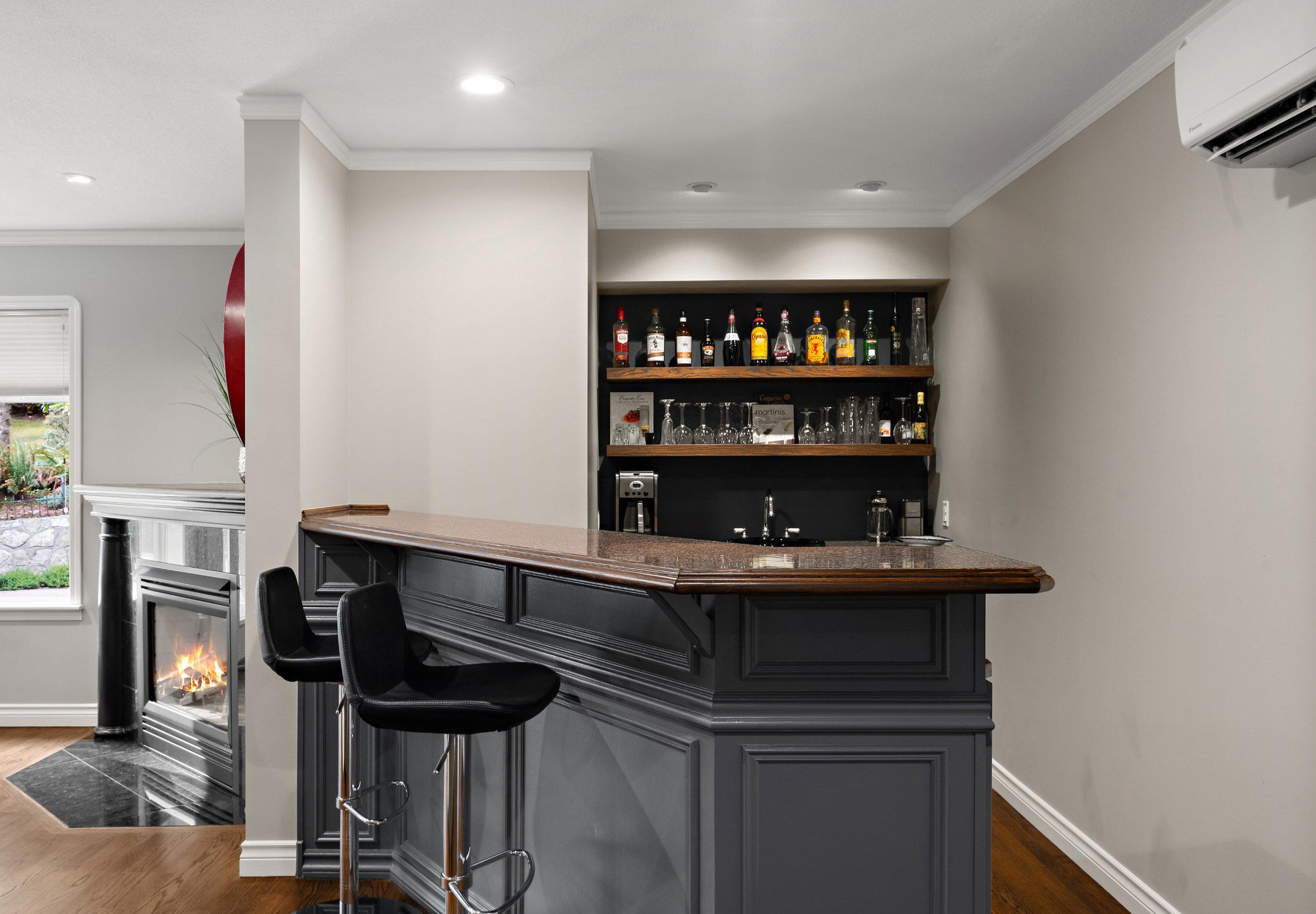 principal rooms including a formal living room with vaulted ceilings and a cozy gas fireplace, a spacious dining area, family room, recreation room,andamediaroomwithawetbar—perfect for entertaining.