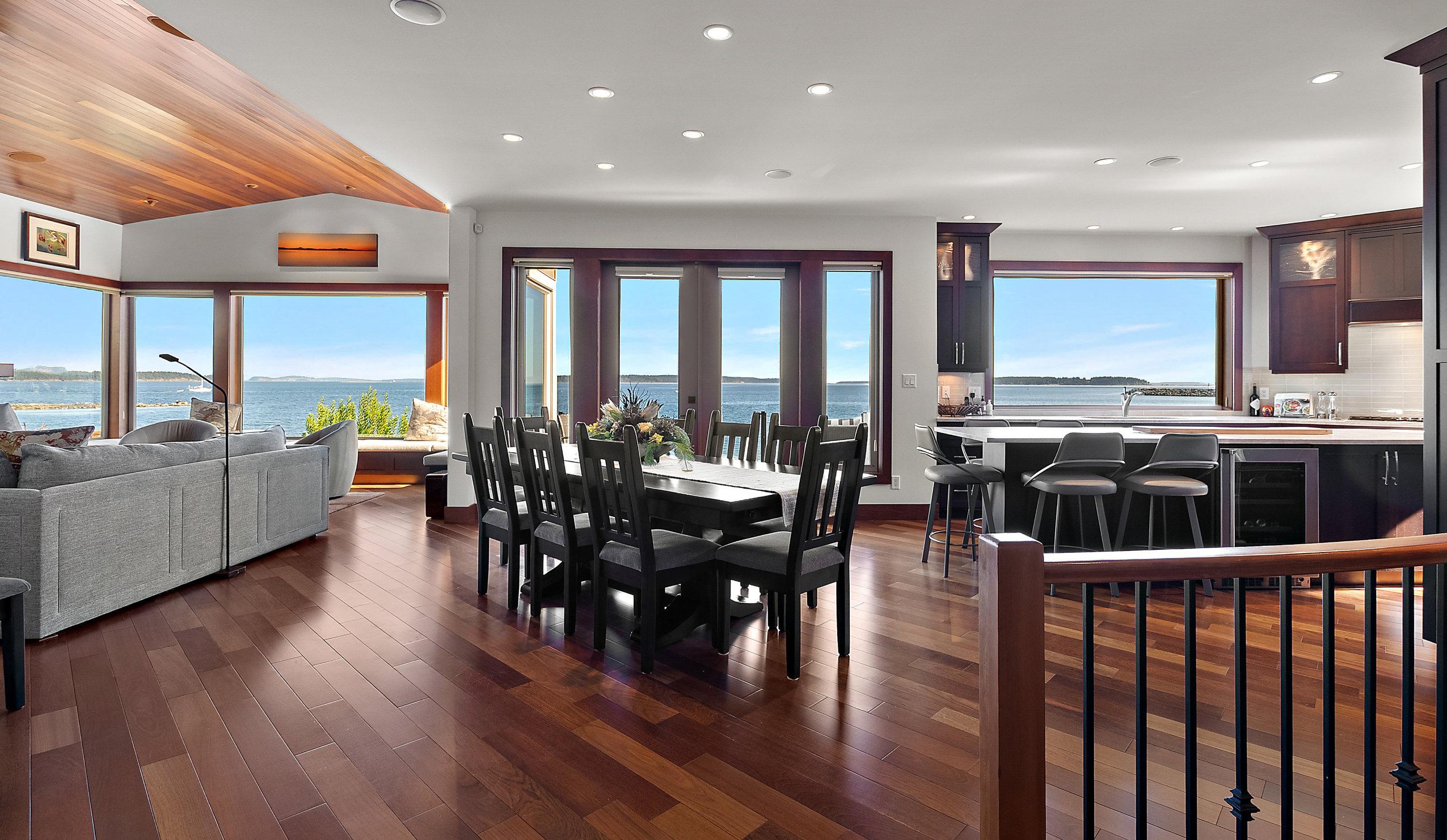 active marine life, sailboats gliding by, playful seals, and a rich array of shorebirds. Step outside to a gently sloping beach—ideal for sunset strolls, beach fires, or launching your kayak. Designed for both elegance and functionality, the home features, a primary suite on the main floor with a spa-inspired ensuite, a gourmet kitchen perfect for entertaining, an open floor plan showcasing spectacular views from all principal rooms, expansive decks and a beautiful patio with a gas fireplace for year-round