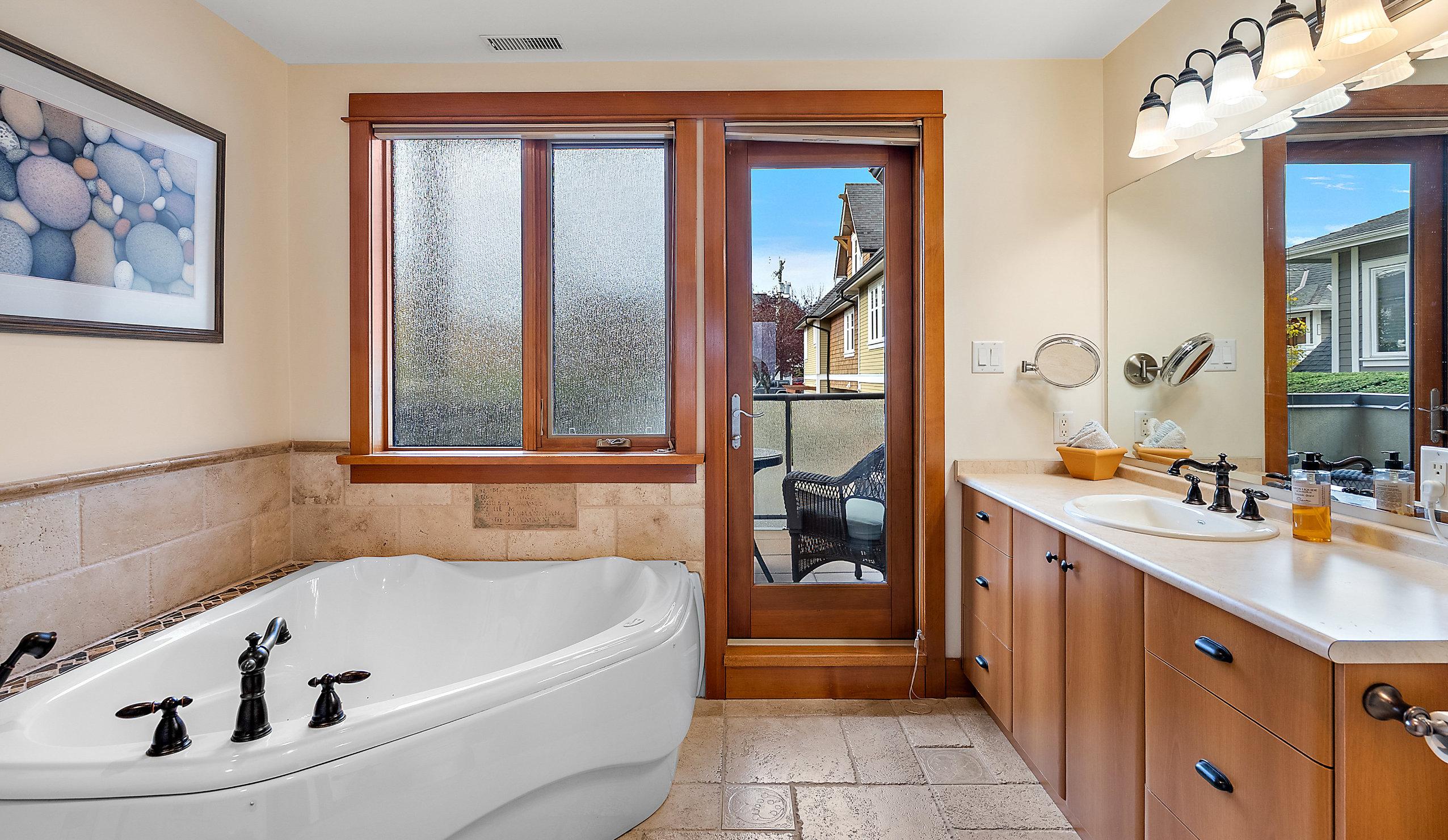 • Bathrooms: 2 1/2 baths. Ensuite bath complete with Jacuzzi Tub, Wal-in steam shower, heated flooring, and a Toto Washlet bidet complete with remote control. Access to large outdoor patio. Ideal for summer and fall evenings to catch afternoon or evening sun.