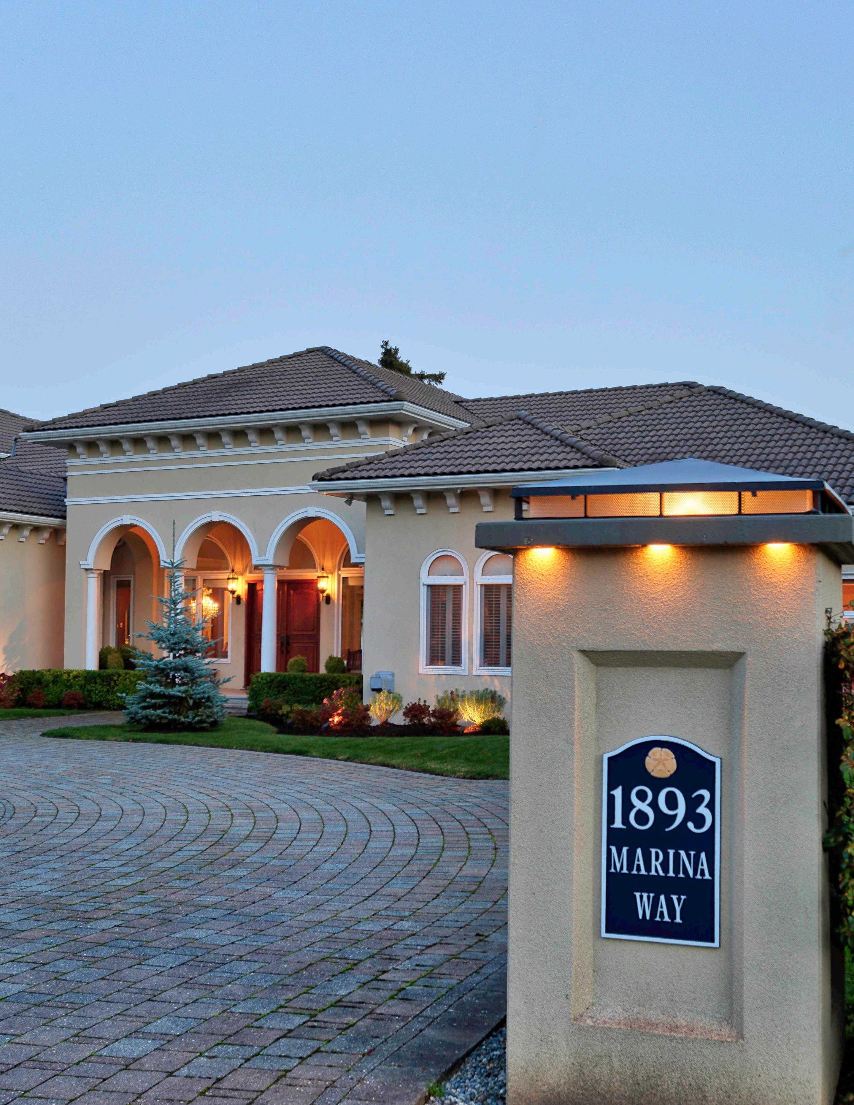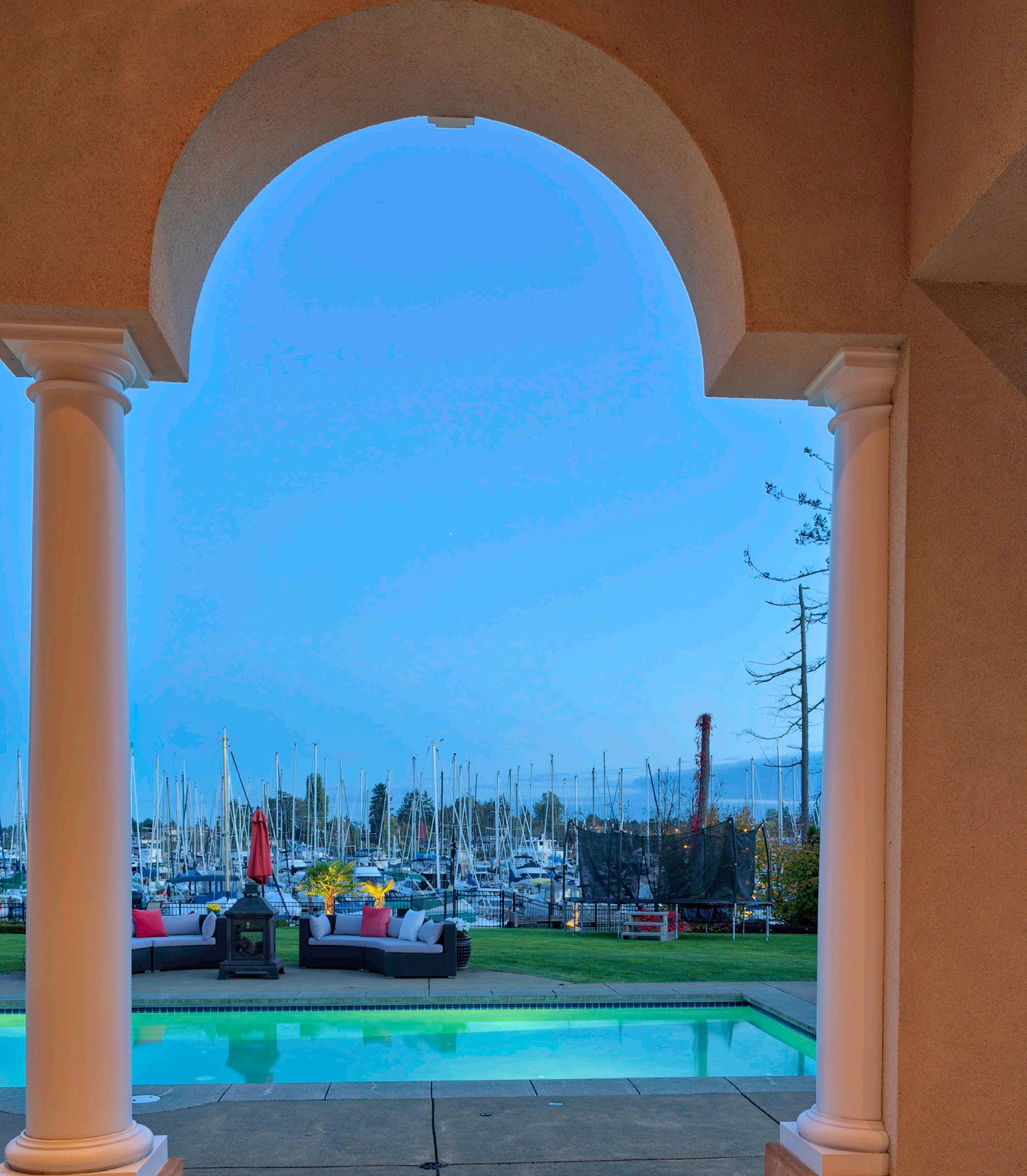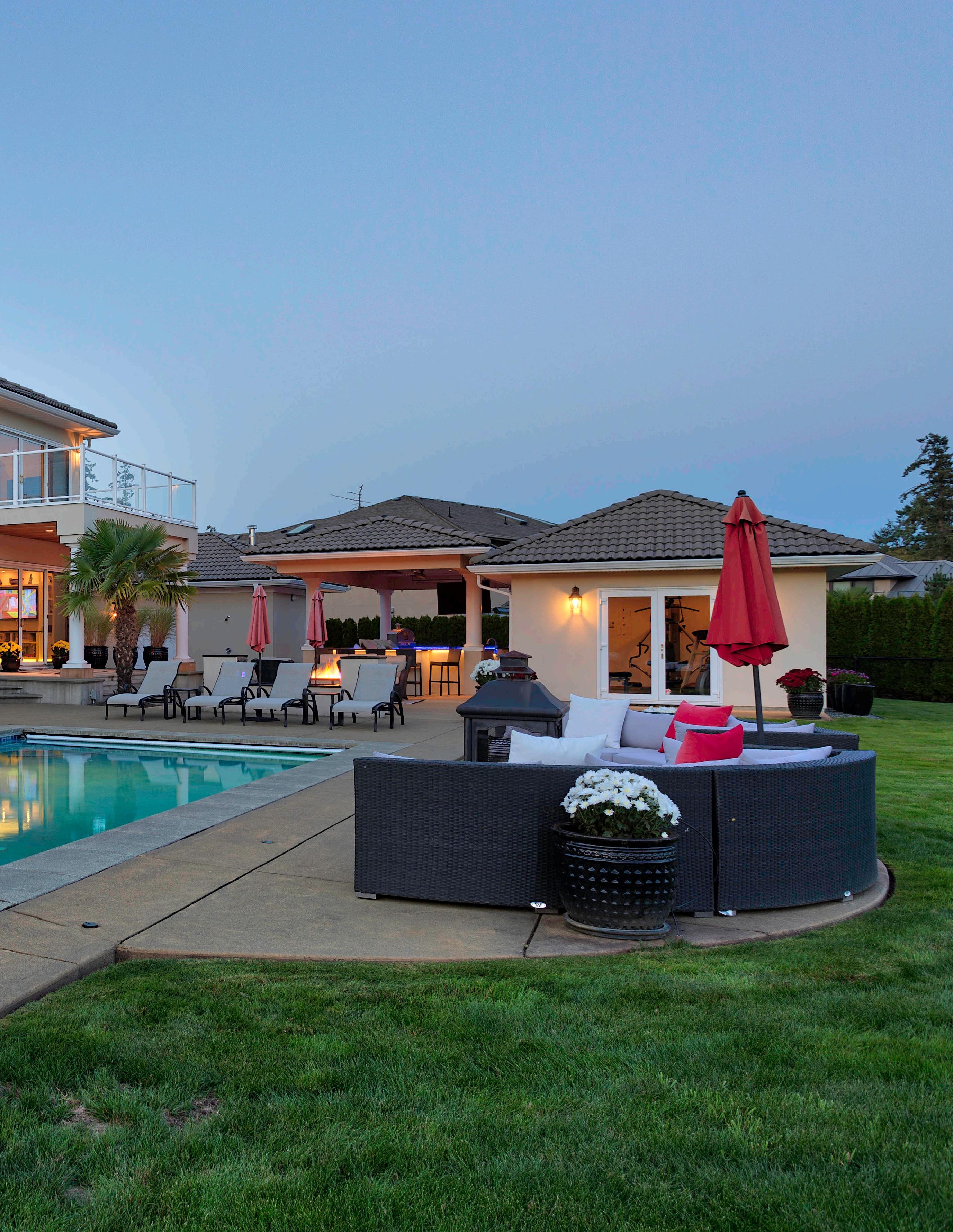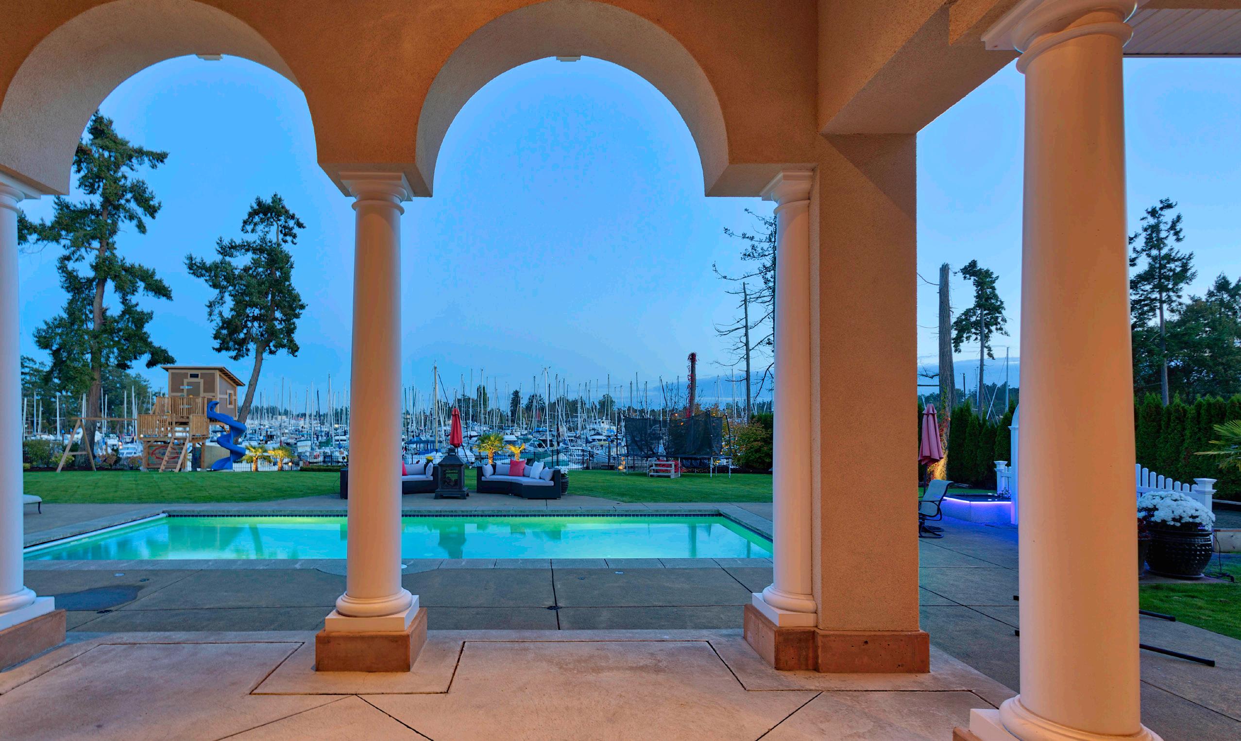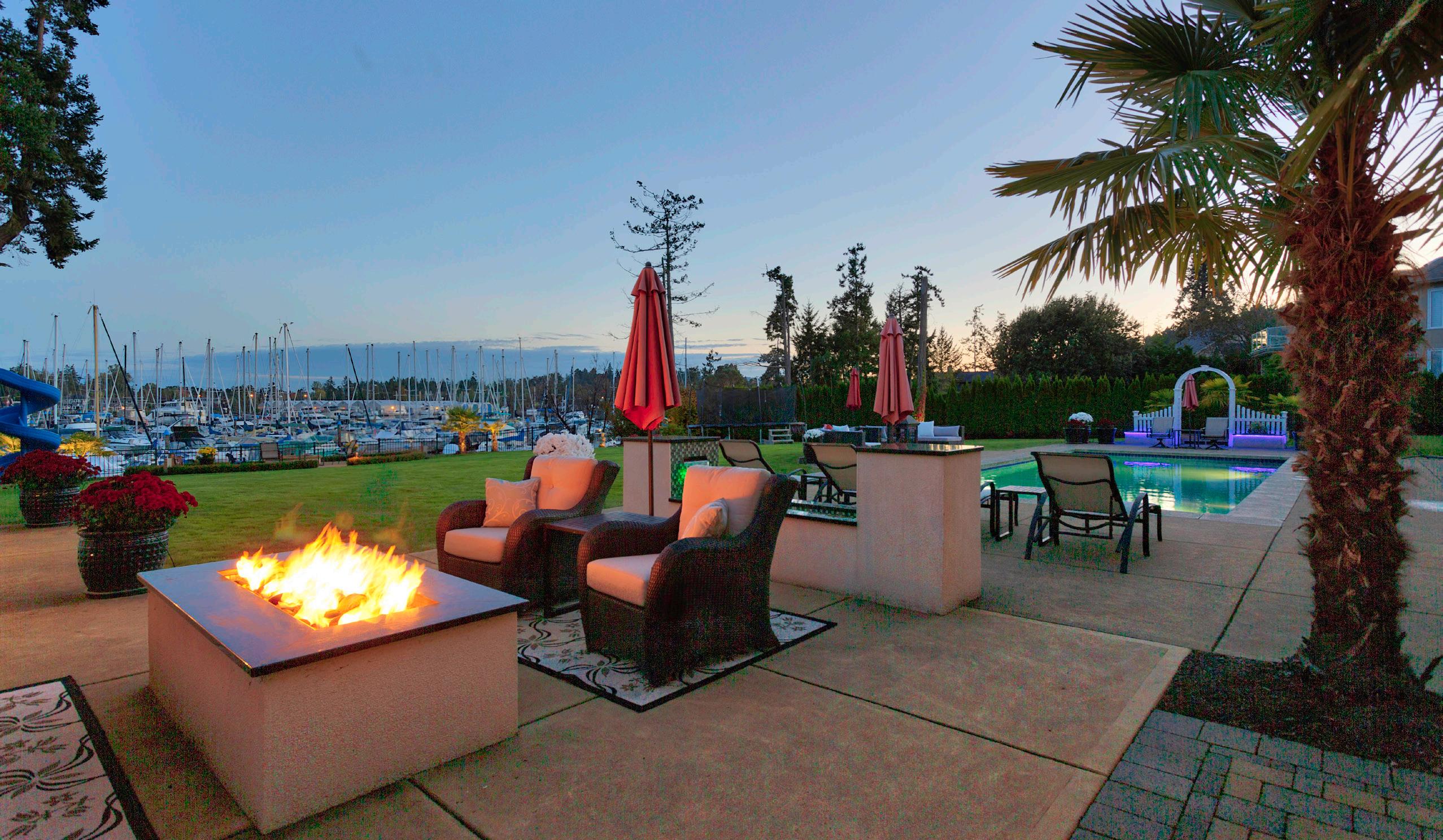 in-ground pool with spectacular Bellagio fountains. Taken with the uplighting on the palm trees, the dimmable potlights in the soffits and the relaxing blue underlighting in both the outdoor kitchen and in the potted plants, the mood is exotic and celebratory. But you don’t always have to party: you can seize a quiet moment to unwind and de-stress in your new hot tub and watch the lights winking from the sailboat masts in the marina. And how about that patio down at the water’s edge with the firepit for an authentic west coast experience under the stars?