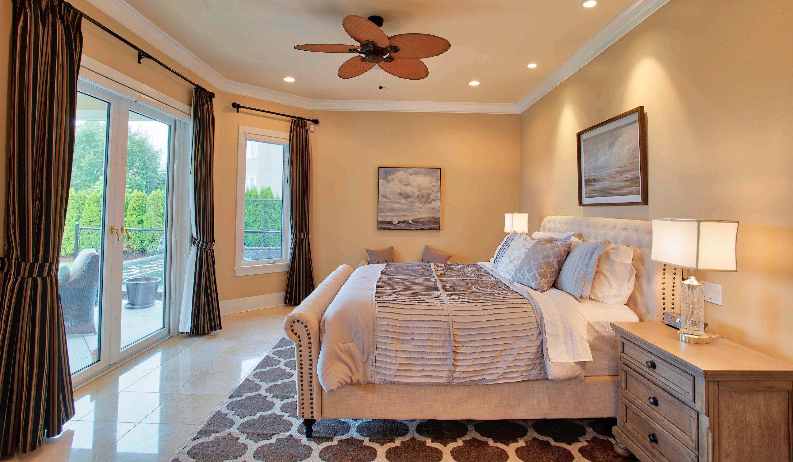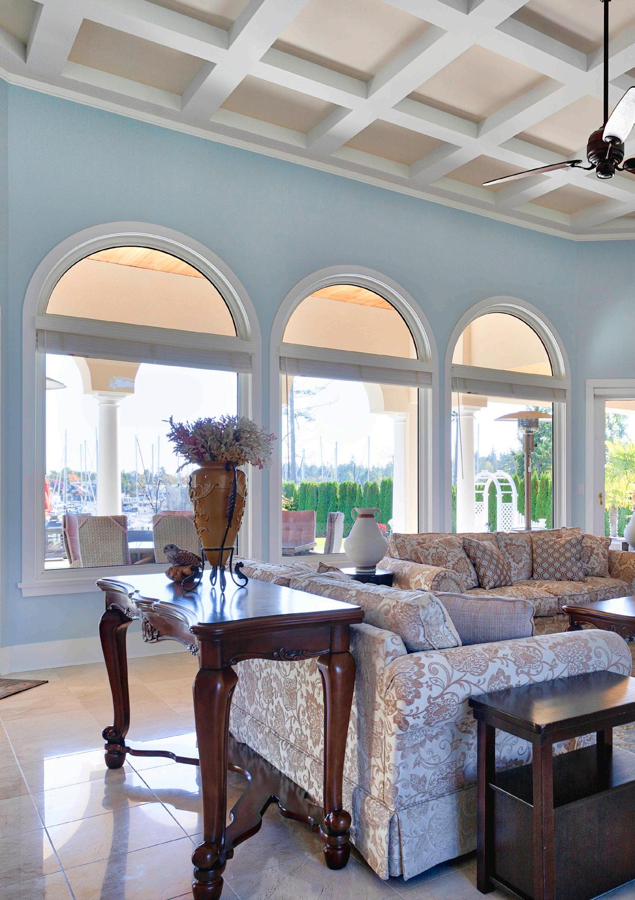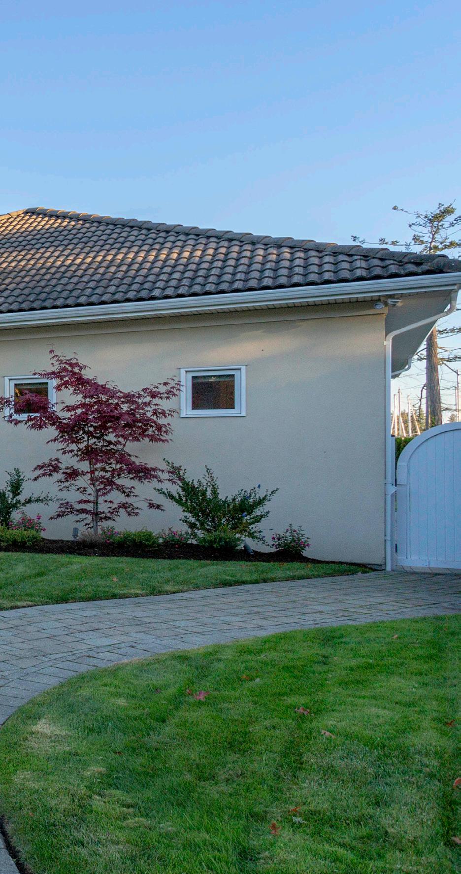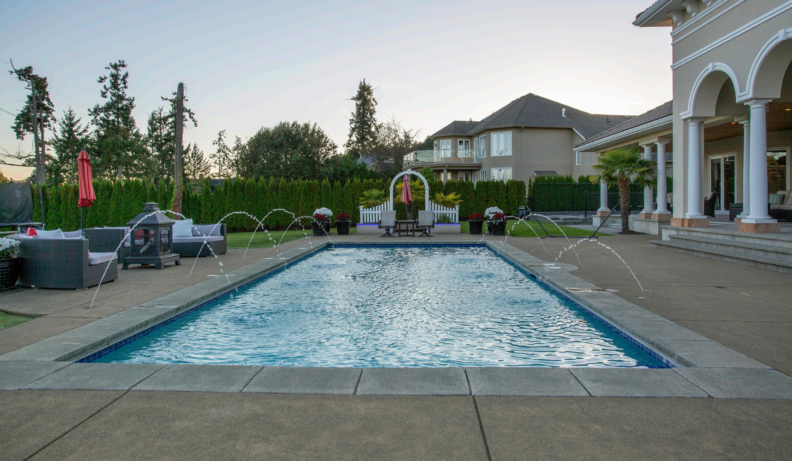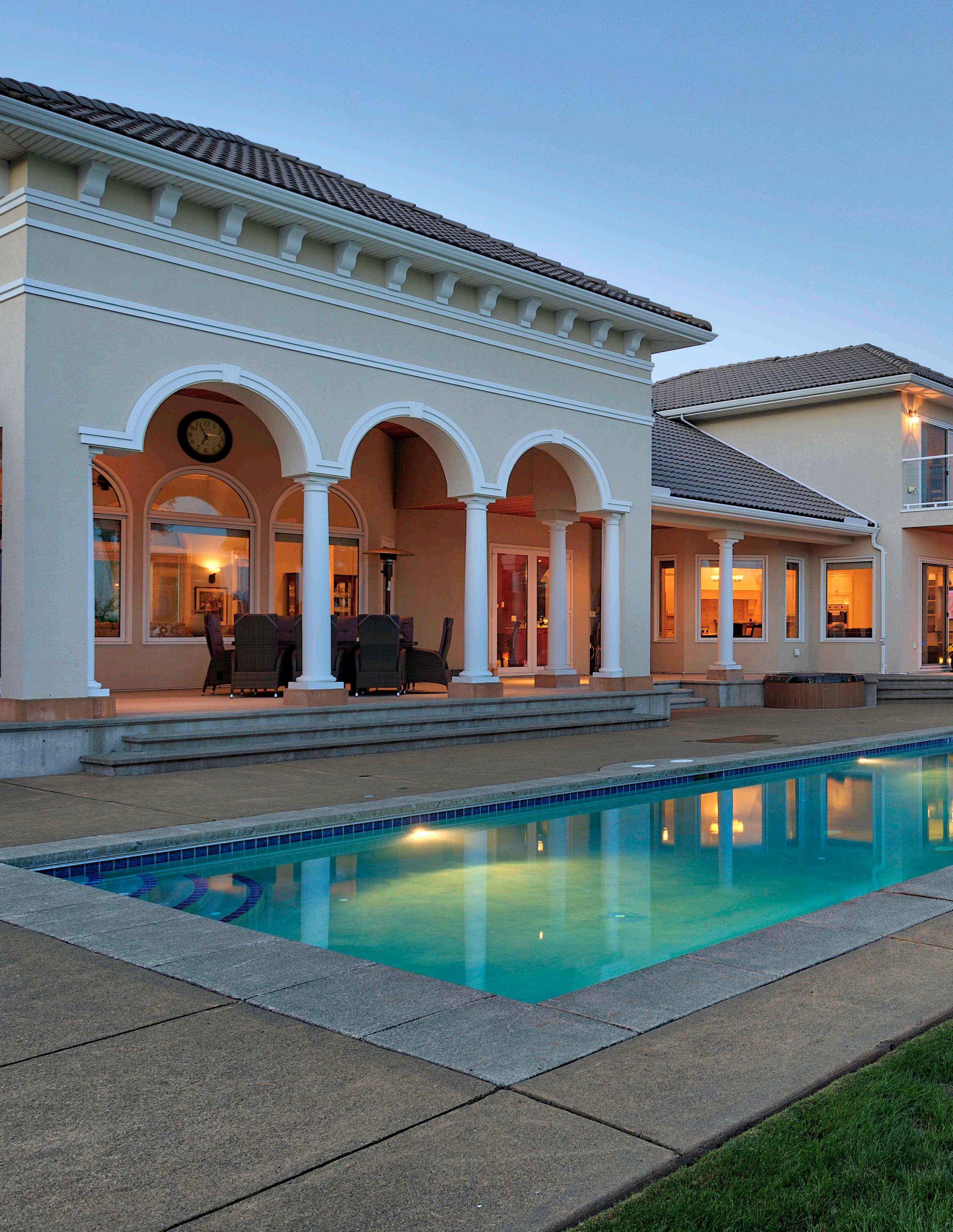 in-ground pool with spectacular Bellagio fountains. Taken with the uplighting on the palm trees, the dimmable potlights in the soffits and the relaxing blue underlighting in both the outdoor kitchen and in the potted plants, the mood is exotic and celebratory. But you don’t always have to party: you can seize a quiet moment to unwind and de-stress in your new hot tub and watch the lights winking from the sailboat masts in the marina. And how about that patio down at the water’s edge with the firepit for an authentic west coast experience under the stars?