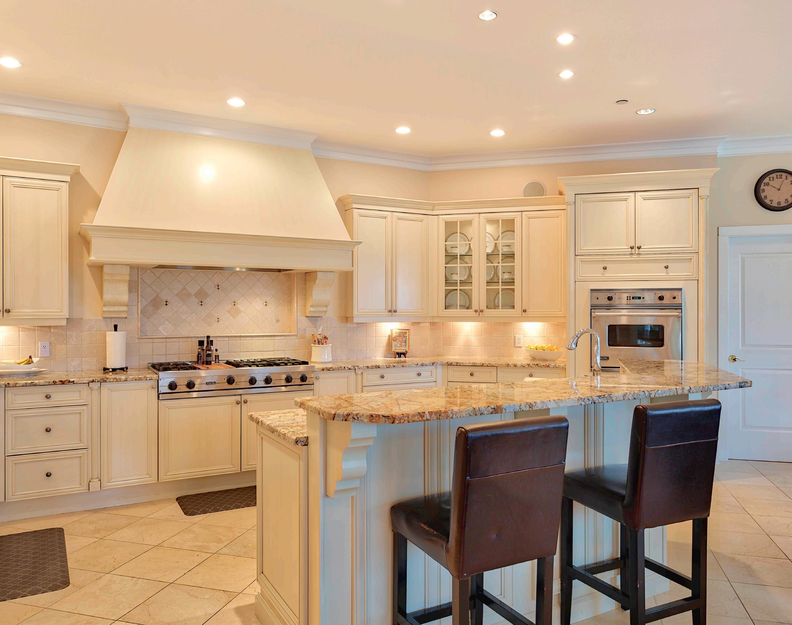 With a six-burner Viking gas range and grill, granite countertops, island seating, glass-fronted cupboards, silent Bosch dishwasher, double Subzero fridge and double Viking ovens, there is no crowd you cannot cater to. Under-cupboard lighting and dimmable potlights mean