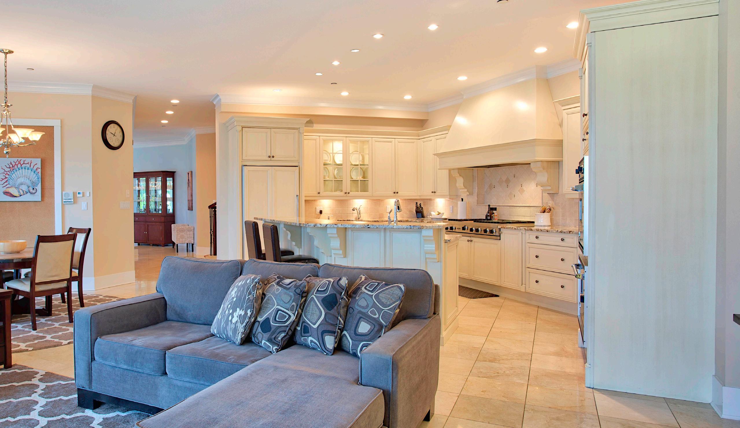 you’ll always be able to achieve just the right lighting level for your task. A walk-in pantry offers extra storage with clever roll-out drawers inside the cupboards, and space for your computer workstation. The kids can help prep dinner at the island, or kick back with a show in the adjoining oceanview great room. And when the meal is all done, you just sweep the crumbs away into the toe-kick baseboard vacuum — a fantastic addition to the house’s built-in vac. Heated Italian marble floors throughout the main level can all be controlled with separate heating zones.