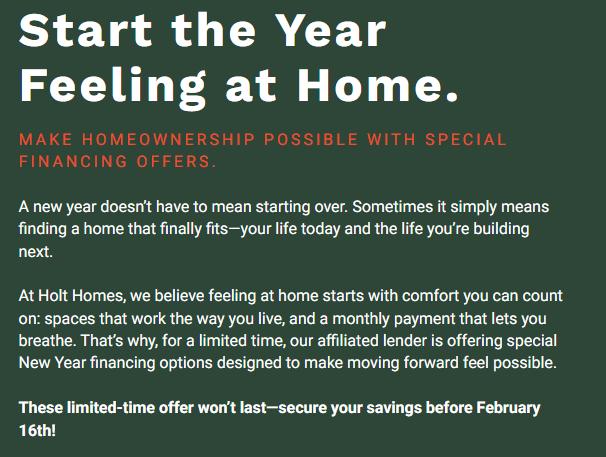 ^LoanpromotionsarevalidforbuyerswhosignpurchaseagreementsonselecthomeswithHoltHomesbetweenFebruary2 2026 andFebruary16 2026 inclusive andcloseonorbeforeMarch31 2026 whenfinancingisprovidedby HomeAmericanMortgageCorporation(seelicensinginformationbelow) Interestrateisnotguaranteedandissubjecttochangewithoutnotice Fundsarelimitedandareavailableonafirst-come first-servedbasis Theactualamountof closingcostassistancecannotexceedthebuyersactualclosingcosts Thisoffercanbeusedwithothernationalorcommunity-levelincentives butthetotalpromotionamountsprovidedforusingHomeAmericanMortgageCorporationare subjecttolegalandloanprogramrequirementsandlimitations Exampleisbasedonasalespriceof$555000anda30-year,fixed-rateconventionalloanwithaninterestrateof4500%anda1000%downpayment Theloanamountis $499500 Monthlyprincipalandinterestpayment=$253089 APR=4621% Taxes,hazardinsurance andmonthlymortgageinsurancepremiumsarenotcalculatedintheabovepayment;theactualpaymentwillbehigher Thisinterestrateis availabletoowneroccupantsonlyandissubjecttoavailability adebt-to-incomeratioof43%orless amaximum90%loan-to-valueratio amaximumloanamountof$832750 qualificationusingfulldocumentation andaminimumFICOscore of780 Otherloan-to-valueratios FICOscores secondhomes andinvestmentpropertiesmaybeeligiblebutmaybesubjecttorateandpriceadjustments NotvalidonloansalreadylockedwithHomeAmericanMortgageCorporation HomeAmerican Mortgage Corporations principal offices are located at 4350 S Monaco Street Suite 100 Denver CO 80237 HomeAmericanMortgage Corporation (NMLS Unique Identifier #130676; NMLS Consumer Access website http://wwwnmlsconsumeraccessorg) 8664007126 OregonLicense#ML-5694 HoltHomes(HH)andHomeAmericanMortgageCorporation(HMC)areowned directlyorindirectly bySekisuiHouseUS Inc and,therefore,areaffiliatedcompanies HHandHMCofferservicesindependentlyofeachother andifyouobtaina productorservicefromonecompany,youarenotrequiredtoutilizetheservicesof,orobtainproductsfrom theothercompany YourdecisiontouseacompanythatisnotaffiliatedwithHHorHMCwillnotaffectyourabilitytoobtain productsandservicesfromthesecompanies
