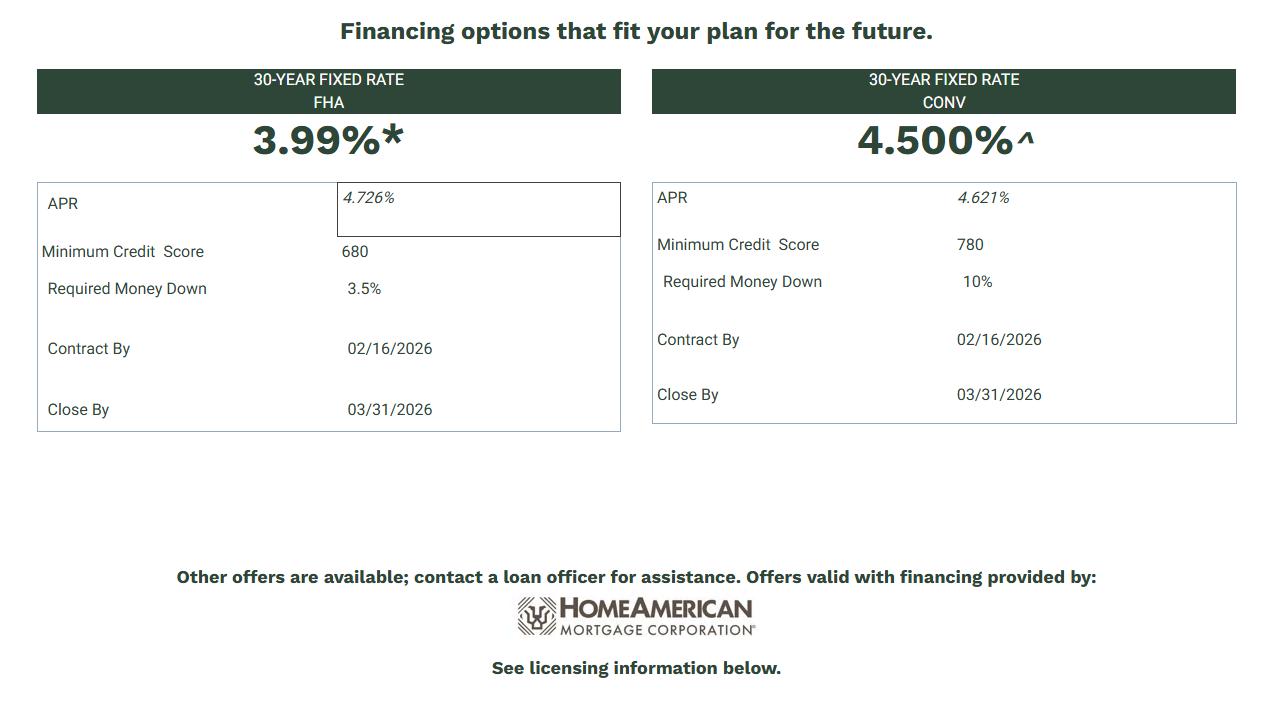 *LoanpromotionsarevalidforbuyerswhosignpurchaseagreementsonselecthomeswithHoltHomesbetweenFebruary2 2026,andFebruary16 2026 inclusive,andcloseonorbeforeMarch31 2026 whenfinancingisprovidedby HomeAmericanMortgageCorporation(seelicensinginformationbelow) Interestrateisnotguaranteedandissubjecttochangewithoutnotice Fundsarelimitedandareavailableonafirst-come first-servedbasis Actualamountofclosing costassistancecannotexceedbuyersactualclosingcosts Thisoffercanbeusedwithothernationalorcommunity-levelincentives butthetotalpromotionamountsprovidedforusingHomeAmericanMortgageCorporationaresubjectto legalandloanprogramrequirementsandlimitations Exampleisbasedonasalespriceof$555000anda30-year fixed-rateFHAloanwithaninterestrateof3999%anda350%downpayment Totalloanamount includingtheupfront mortgageinsurancepremium is$544947 Monthlyprincipalandinterestpayment=$260135 APR=4726%Taxes hazardinsurance andmonthlymortgageinsurancepremiumsarenotcalculatedintheabovepayment;theactualpayment willbehigher Thisinterestrateisavailabletoowner-occupantsonlyandissubjecttoavailability adebt-to-incomeratioof43%orless,amaximum965%loan-to-valueratio qualificationusingfulldocumentation,andaminimumFICOscore of680 Otherloan-to-valueratiosandFICOscoresmaybeeligiblebutmaybesubjecttorateandpriceadjustments Loanamountcannotexceedthelesserofthecountylimitor$832,750 NotvalidonloansalreadylockedwithHomeAmerican MortgageCorporation