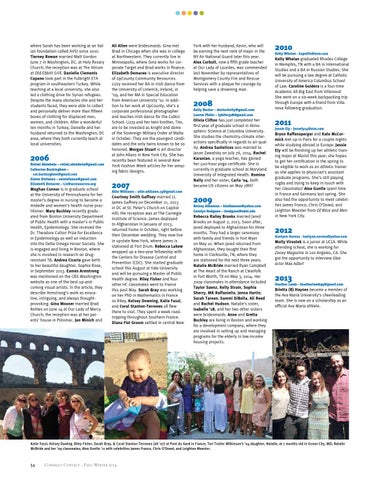 Meghan Connor is in graduate school at the University of Pennsylvania for her master’s degree in nursing to become a midwife and women’s health nurse practitioner. Mary Buckley recently graduated from Boston University Department of Public Health with a master’s in Public Health, Epidemiology. She received the Dr. Theodore Colton Prize for Excellence in Epidemiology as well an induction into the Delta Omega Honor Society. She is engaged and living in Boston, where she is involved in research on drugresistant TB. Andrea Cicoria gave birth to her beautiful daughter, Sophia Rose, in September 2013. Eames Armstrong was mentioned on the CBS Washington website as one of the best up-andcoming visual artists. In the article, they describe Armstrong’s work as evocative, intriguing, and always thoughtprovoking. Gina Mouser married Brad Rohles on June 14 at Our Lady of Mercy Church; the reception was at her parents’ house in Potomac. Jen Minich and