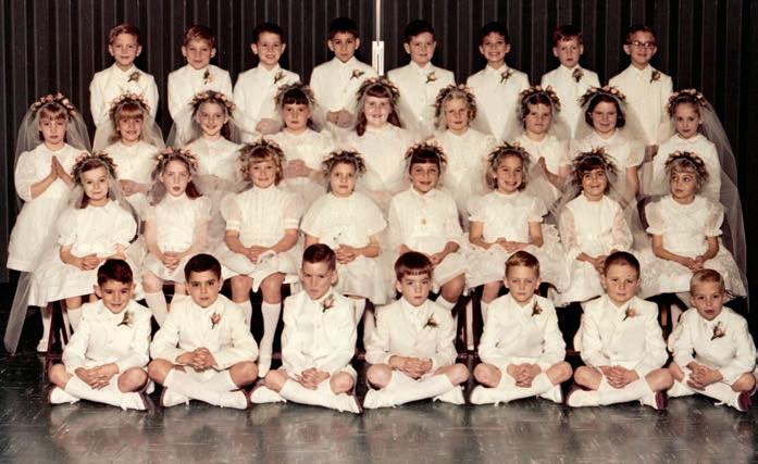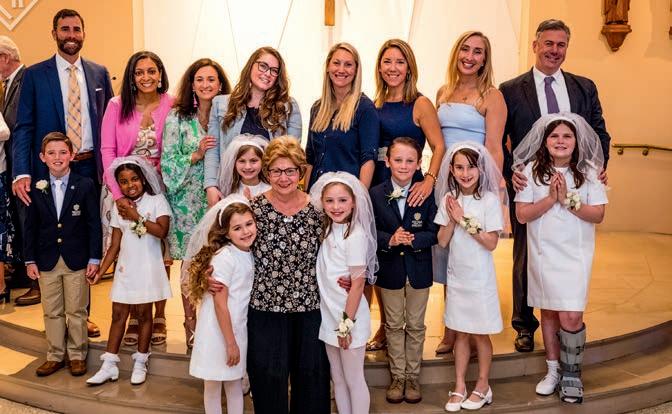 Eight alumni parents, whose Grade 2 children celebrated their First Holy Communion on April 27, 2024, pose for a photo with their children and former second grade teacher Mrs. Cassidy. Back row left to right: Paul Nolen ’95, Persia Ali ’96, Joanne Pettit Robinson ’94, Lauren Keleher Lashinger ’93, Mollie Manno Miller ’99, Katie Manno Pagliaro ’94, Anne Schoemaker Vazquez ’95, and Mike Finelli ’89. Middle row left to right: Christopher Nolen, London Ali, Mia Lashinger, Luca Pagliaro, Reagan Vazquez, and Devon Finelli. Front row left to right: Allie Robinson, Judy Wankmiller Cassidy ’59 P’85’86’90’93, and Maddie Miller.