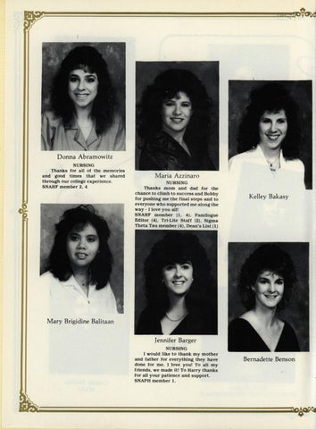Thanks mom and dad for the chance to climb to success and Bobby for pushing me the final steps and to everyone who supported me along the way - I love you all! SNAHF member (I, 4), Familogue Editor (4), Tri-Lite Staff (2), Sigma Theta Tau member (4), Dean's List (I)