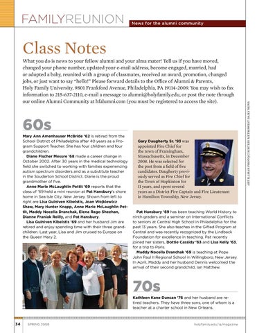 What you do is news to your fellow alumni and your alma mater! Tell us if you have moved, changed your phone number, updated your e-mail address, become engaged, married, had or adopted a baby, reunited with a group of classmates, received an award, promotion, changed jobs, or just want to say “hello!” Please forward details to the Office of Alumni & Parents, Holy Family University, 9801 Frankford Avenue, Philadelphia, PA 19114-2009. You may wish to fax information to 215-637-2110, e-mail a message to alumni@holyfamily.edu, or post the note through our online Alumni Community at hfalumni.com (you must be registered to access the site).