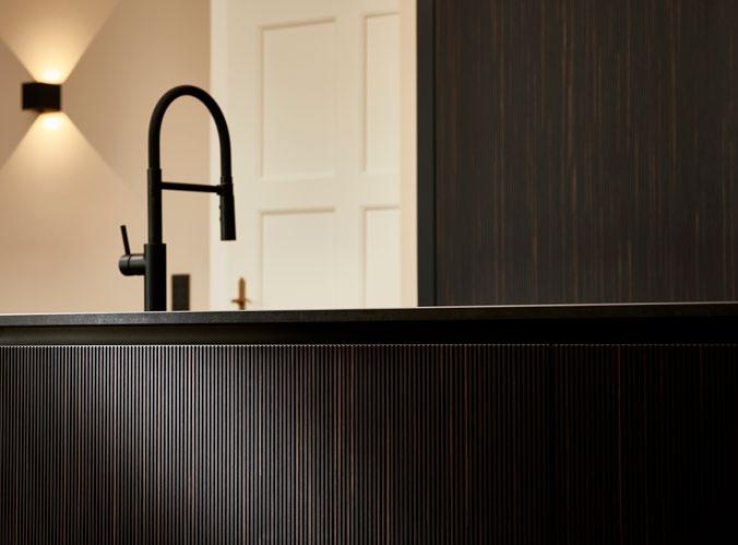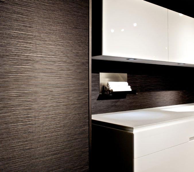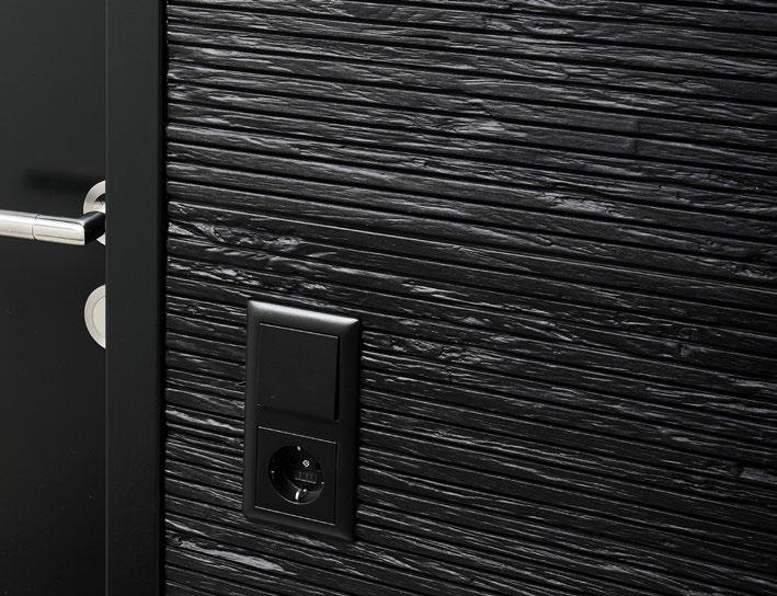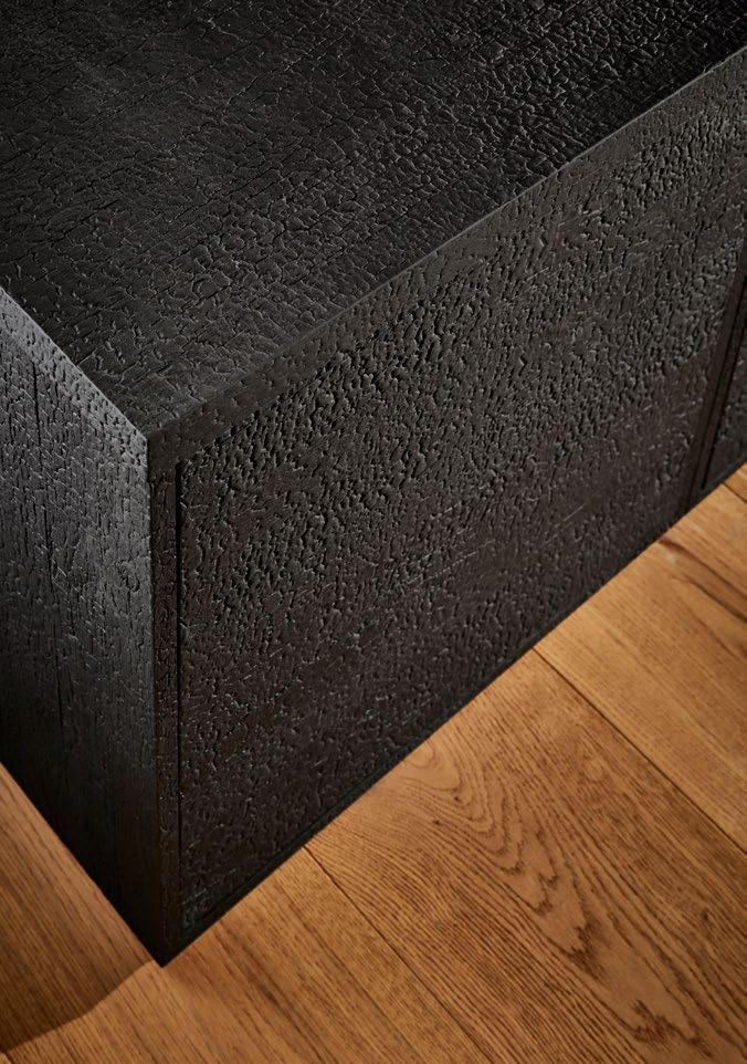 Flamed Wood verkörpert verkohltes Holz detailgetreu, ohne tatsächlich verbrannt zu sein. Durch Verprägen der Furnierschichten entsteht eine resistente Oberfläche, ohne verbrannten Geruch.