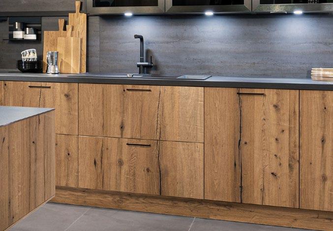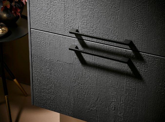 Burned Wood verkörpert verkohltes Holz detailgetreu, ohne tatsächlich verbrannt zu sein. Durch Verprägen der Furnierschichten entsteht eine resistente Oberfläche, ohne verbrannten Geruch.