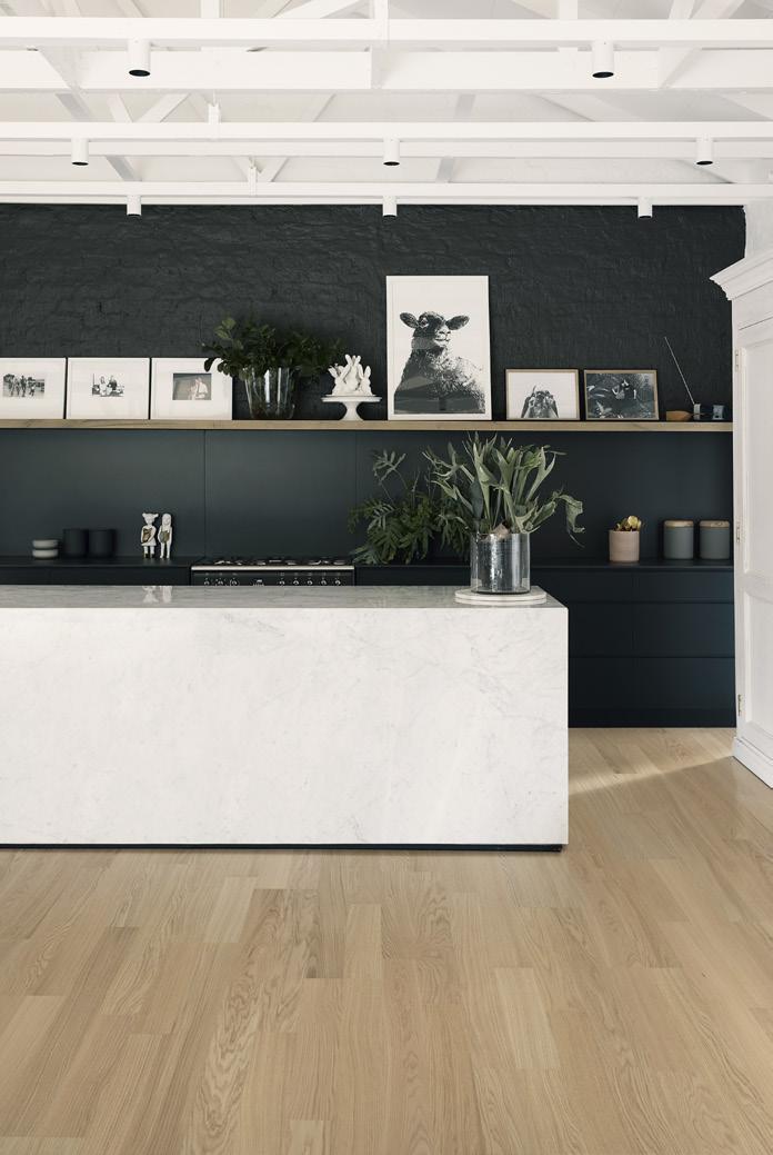 Dieses umwerfende Stadthaus mit einem kleinen Privatgarten liegt mitten im Stadtzentrum. Es eignet sich perfekt für die hier lebende kleine Familie mit einem Kind und zwei Hunden. Große Glastüren verbinden die Innenräume mit dem Außenbereich. In der Küche erinnert der Anstrich einer Wand in einem gedeckten Grünton an tiefe Wälder. Die dunklen Böden aus der Kährs LifeKollektion passen perfekt zum Stil des Hauses und sie verleihen ihm einen warmen und gemütlichen Look, der alles harmonisch zusammenfügt. Die Wärme und die Lebhaftigkeit von Walnuss verstärkt das heimelige Gefühl. Die Wahl war schnell getroffen, denn dieser wunderschöne, langlebige Boden erfüllte alle Anforderungen der Familie.