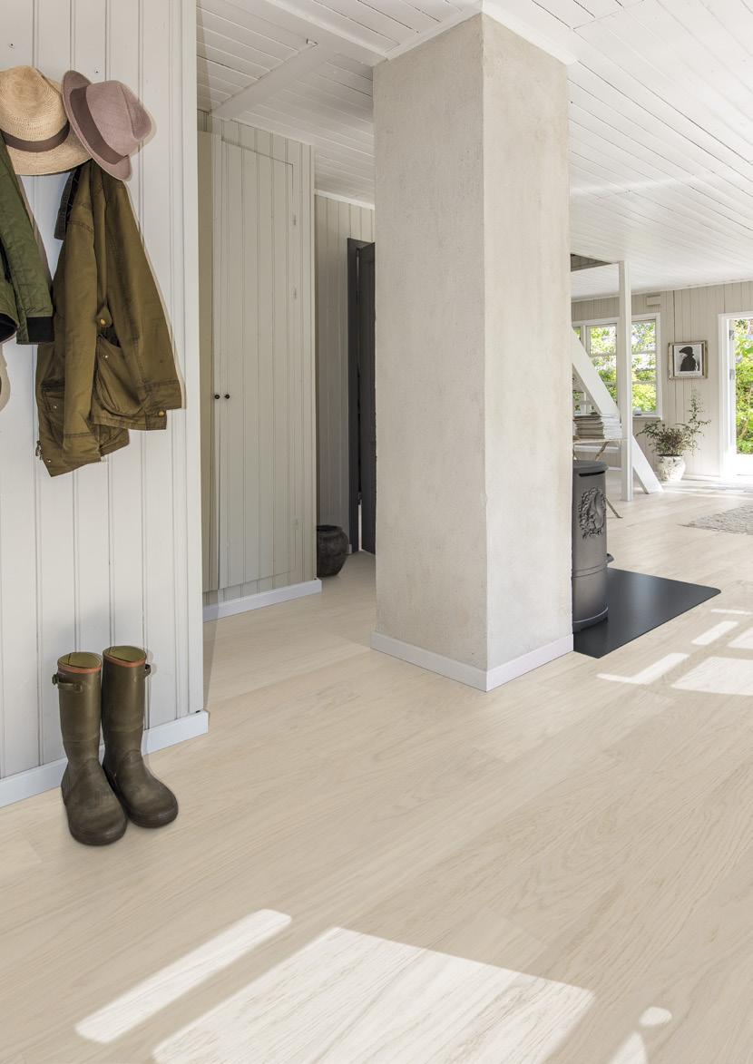 Dieses gemütliche Landhaus liegt in einem Waldstück, umgeben von alten Eichenbäumen. Das Sonnenlicht wird sanft durch die Baumkronen gefiltert, so dass sowohl außen als auch innen Silhouetten entstehen. Die hier lebende Familie hat sich für einen hellen Holzfußboden entschieden – Coconut Cream aus der LifeKollektion. Dieser wurde in unterschiedlichen Formaten verlegt, um im gesamten Haus dynamisch wirkende Flächen zu erzeugen. Der aktive Lebensstil der Familie, mit Mountainbiking, Wandern und Gartenarbeit, stellt hohe Ansprüche an ihre Böden. Die Wahl fiel deshalb auf einen Kährs Life Echtholzboden mit seinen herausragenden Leistungseigenschaften.