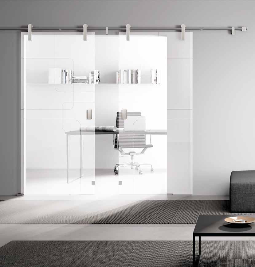 Ein filigranes Rahmenprofil von nur 6 mm Breite umzeichnet die Glasfläche des Schiebetürsystems PLANEO AIR. Sein mattes Schwarz steht im Kontrast zur strahlend weißen Glasfläche. Neben dem ästhetischen Wert bietet das Profil zusätzlichen Schutz für die Glaskante.
