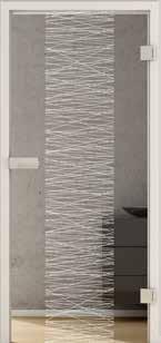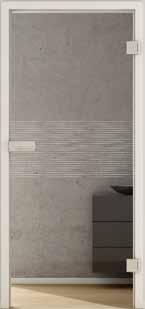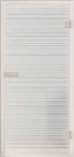 Feinste, quer verlaufende Linien in variablen Abständen kennzeichnen das Design dieser Glastüren. Die grafische Gestaltung betont die Horizontale und wirkt dabei zeitlos und klar.