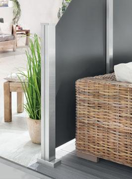 Unsere SYSTEM GLAS Sichtschutz-Elemente bestehen aus 8 mm starkem Einscheiben-Sicherheitsglas - ESG (gemäß EN 12150). Die Dekorprofile Delta und Theta sind aus 6 mm starkem Einscheiben-Sicherheitsglas. Glas ist ein Naturprodukt, produktionstechnisch bedingt changiert die Glasfarbe je nach Lichteinfall, Blickwinkel und Produktionscharge, insbesondere an der oberen Kante eines jeden Glasfeldes. Glas bietet gegenüber vielen anderen Materialien Vorteile: es ist winddicht, lichtdurchlässig und beständig gegenüber Temperaturwechseln.