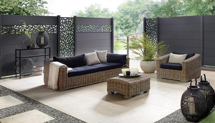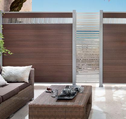 Profile aus Aluminium oder aus WPC mit AluminiumPfosten und Aluminium-Abschlussprofilen in Anthrazit, inklusive schwarzer Kunststoff-Einsätze.