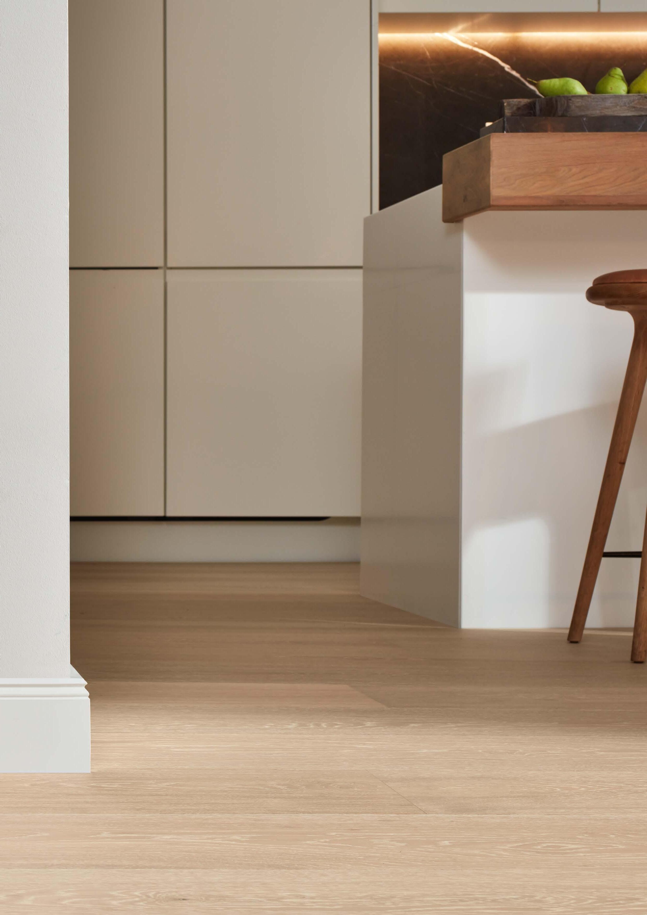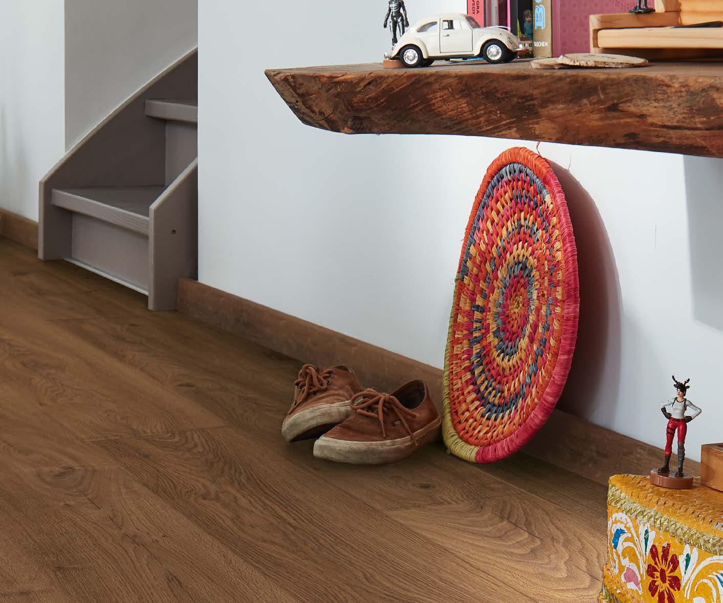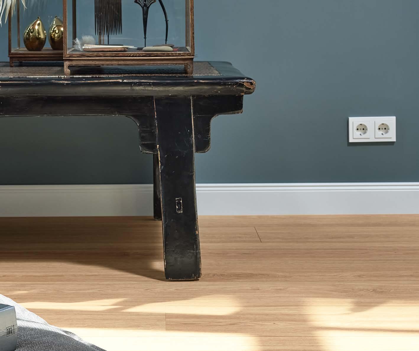 Harmonie pur zwischen Boden und Fußleisten bringen dekor- bzw. farbgleiche Leisten. Sie sind abgestimmt auf das Dekor des jeweiligen Bodens und verlängern dadurch optisch den Boden zur Wand hin.