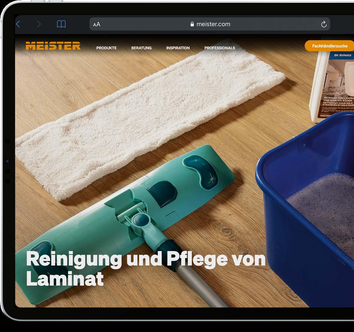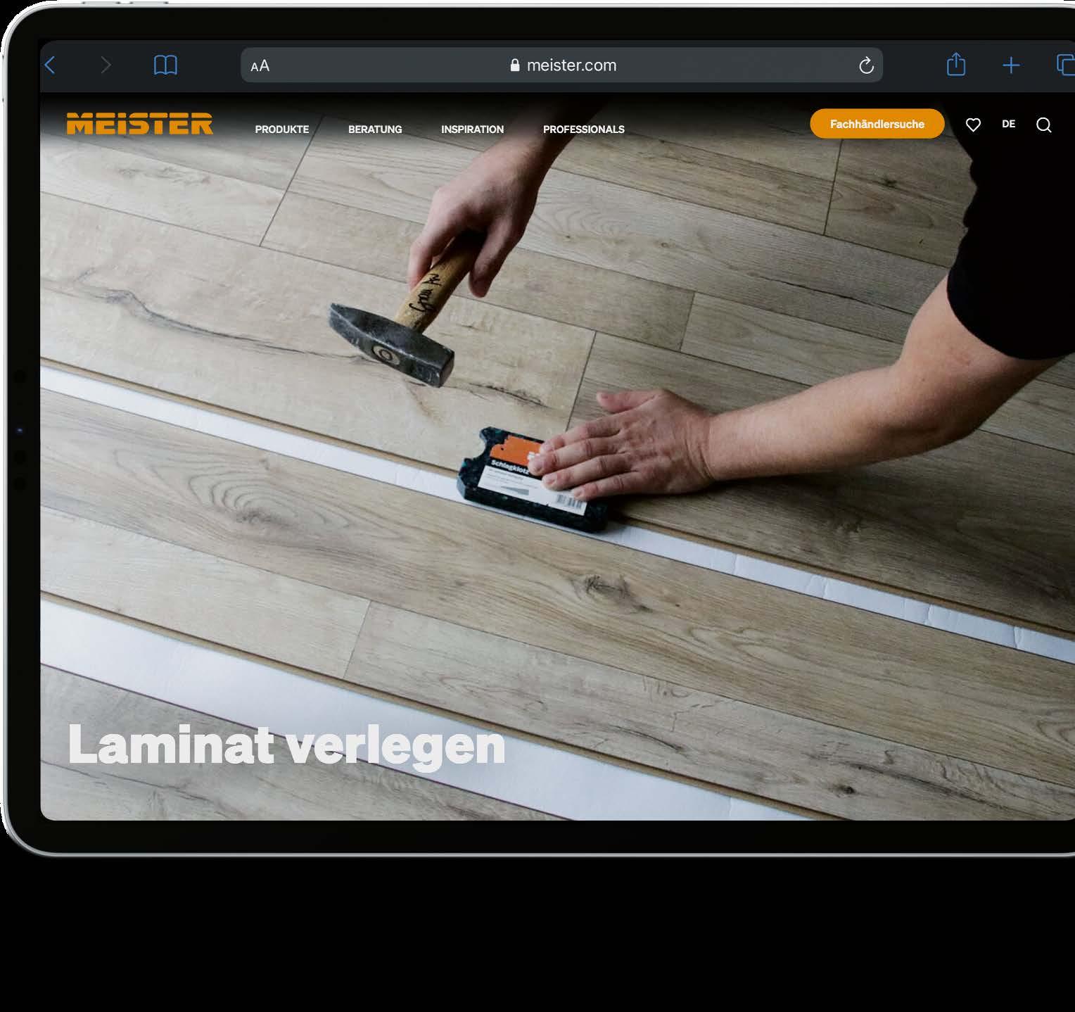 Von der Bodenauswahl über die Verlegung bis hin zu Reinigung, Werterhaltung und kleineren Reparaturen bietet Ihnen unsere Website www.meister.com und unser Youtube-Kanal (youtube.com/MeisterWerkeTV) wertvolle Tipps und Informationen rund um Ihren neuen MEISTER-Laminatboden!