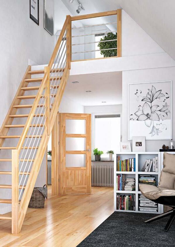Besonders tiefe und breite Stufen ebnen mit der DOLLE Cork den sicheren sowie bequemen Weg nach oben. Ähnlich wie die DOLLE Dublin (s. S. 11) verbindet diese Mittelholmtreppe moderne Optik mit sachlicher Funktion, bietet dabei aber mehr Raum für den buchstäblich großen Auftritt. Ein Geländer ist im Lieferumfang bereits enthalten. Zur Auswahl stehen ein Einzelstab- oder ein Edelstahlgeländer.