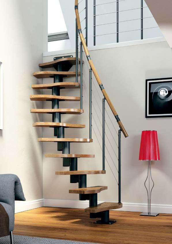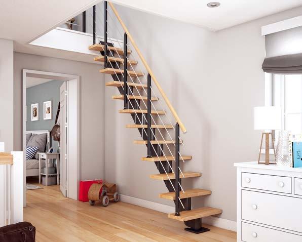 Dieses vielseitige Treppenmodell mit pulverbeschichtetem Mittelholm aus Metall und geraden Holzstufen fügt sich flexibel in jeden Raum ein. Die einzelnen Elemente des Mittelholms bieten optisch dank innen liegender Verschraubung einen fast völlig ebenmäßigen Eindruck. Die Holzstufen aus Buche oder Eiche sind geölt. Das Designgeländer ist im Lieferumfang inbegriffen.
