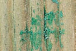 Ein häufiger Effekt bei kesseldruckimprägnierten Hölzern ist die grünliche Anfärbung an der Oberfläche, insbesondere im Bereich von Ästen. Es handelt sich hier um austretendes Harz, das von den Kupfersalzen der Imprägniermittel weißlich bis grün gefärbt wird. Die Flecken wittern nach einiger Zeit ab.