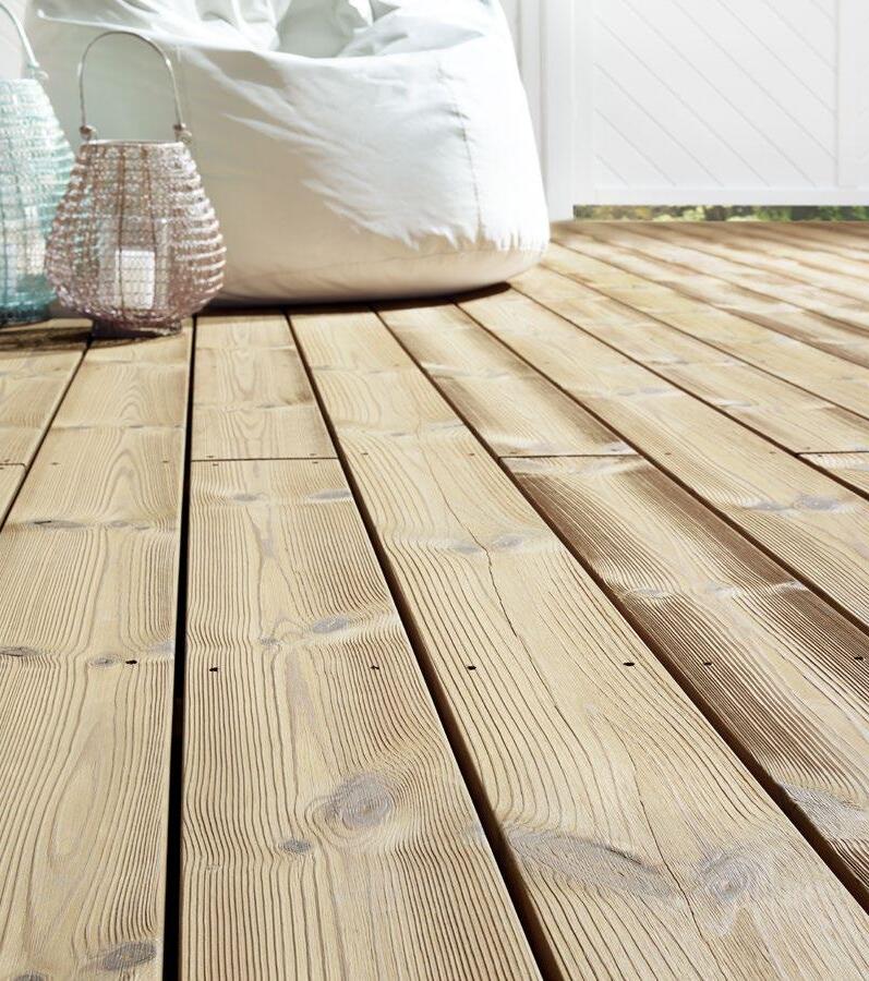 Das skandinavische Holz zeichnet sich durch ein charakteristisches Astvorkommen aus. Durch ein thermisches Verfahren wird nicht nur die Haltbarkeit der Kiefer verbessert, sie bekommt auch eine angenehme helle bräunliche Farbe. Bei der gebürsteten Oberseite kommt die lebhafte Maserung der Kiefer besonders schön zur Geltung.