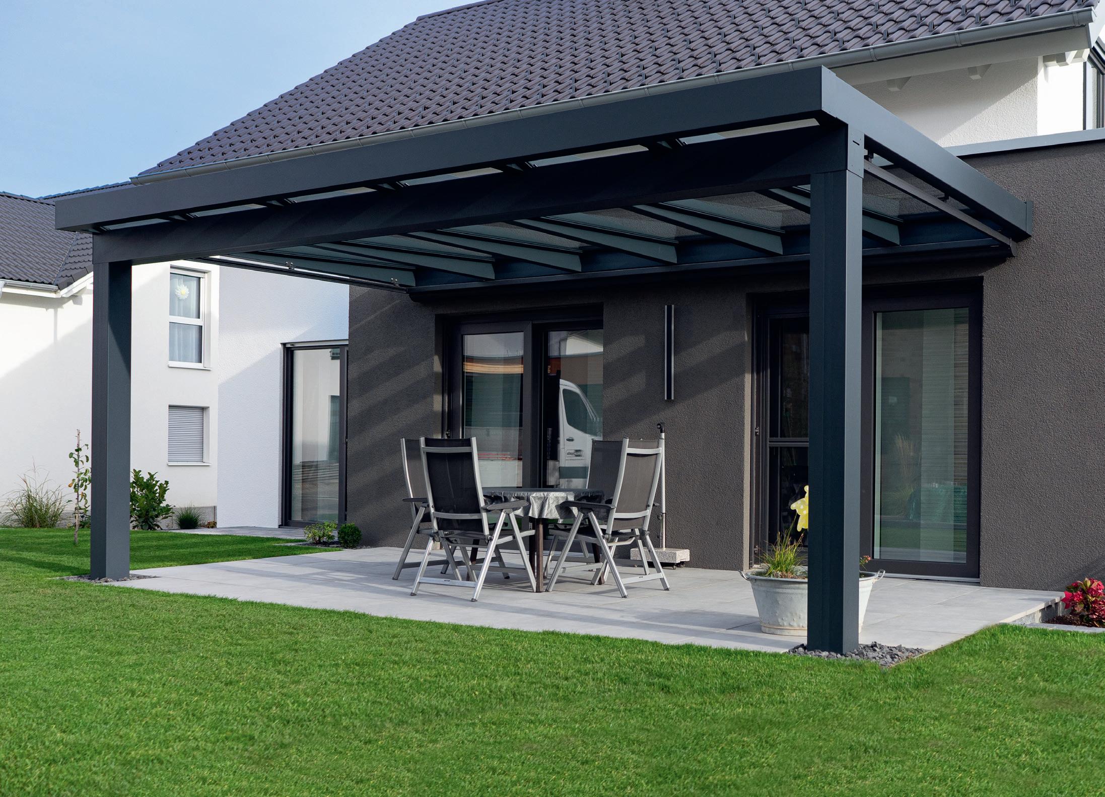 Das markante Rinnenprofil und ein stärkeres Pfostenmaß verleihen der SUPREMELINE eine äußerst stabile Konstruktion und vergrößern den Pfostenabstand bei großflächigen Überdachungen deutlich. Damit ist auch bei größeren Dachbreiten (bis zu 7000 mm mit zwei Pfosten) ein freier Blick in den Garten und die Umgebung gewährt. Wie die PRIMELINE-Serie überzeugt auch die SUPREMELINE durch einen einfachen Konstruktionsaufbau, eine variable Dachneigung, den integrierten Wasserablauf im Pfosten und die maßgenaue Anpassung.