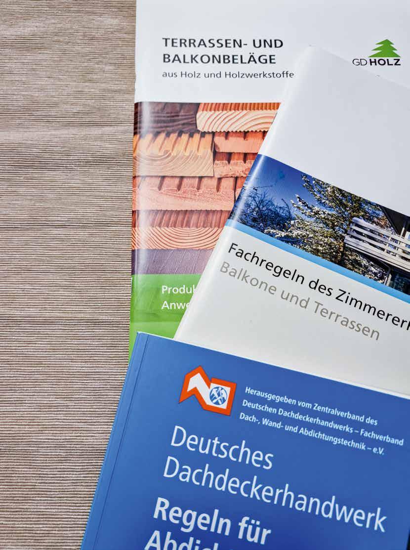 Der Terrassenbau bedarf fachmännischer Kenntnisse und unterliegt allgemein anerkannten Regelwerken, wie z B der Broschüre „Terrassen- und Balkonbeläge” vom GD-Holz Vergessen Sie nicht, sich für eine erfolgreiche Planung und Ausführung über örtliche Bauvorschriften zu informieren und achten Sie auf die Verlegehinweise der Dielen und Befestigungsmaterialien