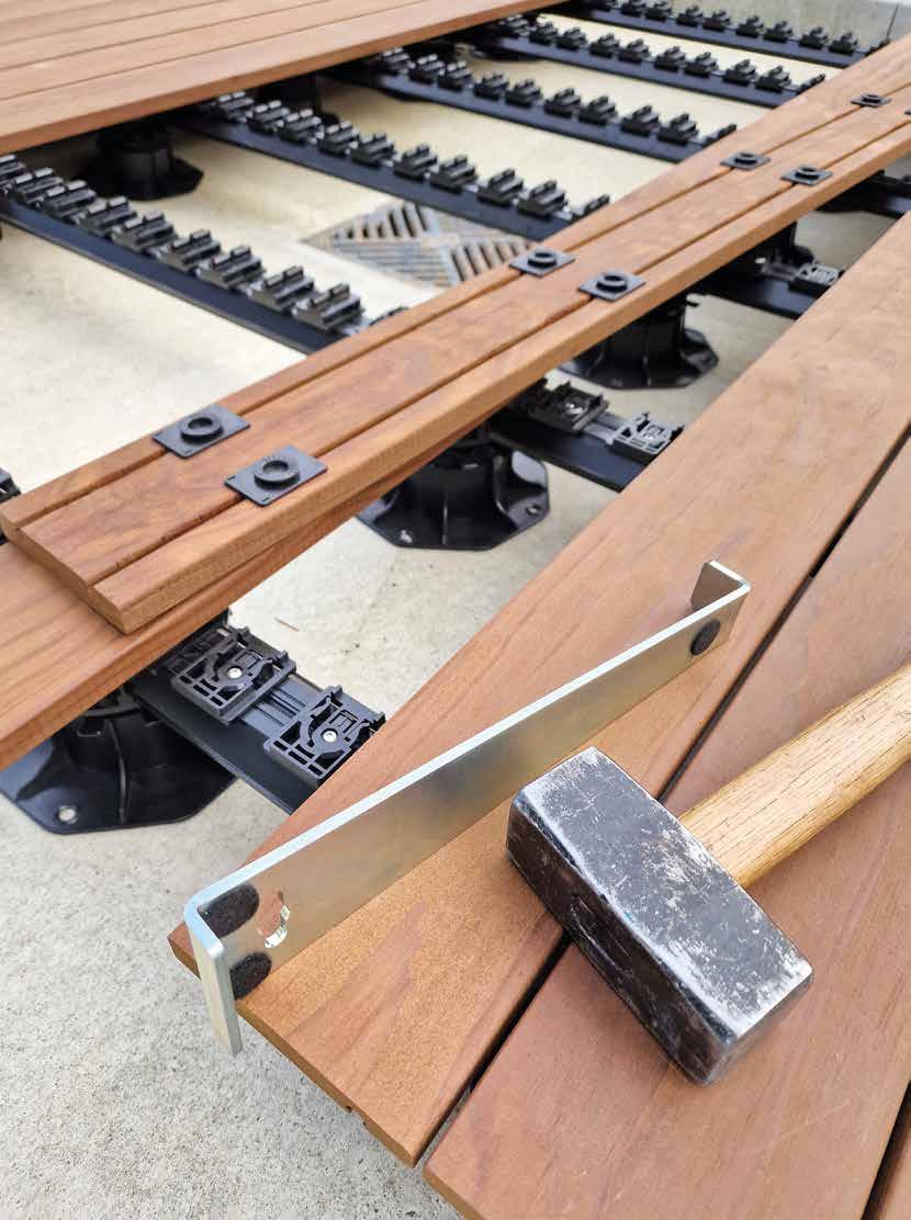 Beim Verlegen von Terrassendielen aus Tropenhölzern mit Clipper ist eine doppelte Unterkonstruktion am Anfang und am Ende des Terrassendecks (Auflagepunkte der Dielenenden) notwendig: Abstand der UK bei der Doppelunterkonstruktion: maximal 20 cm. Für eine gute Unterlüftung muss gesorgt werden: unsere Empfehlung: mind 150 mm Aufbauhöhe
