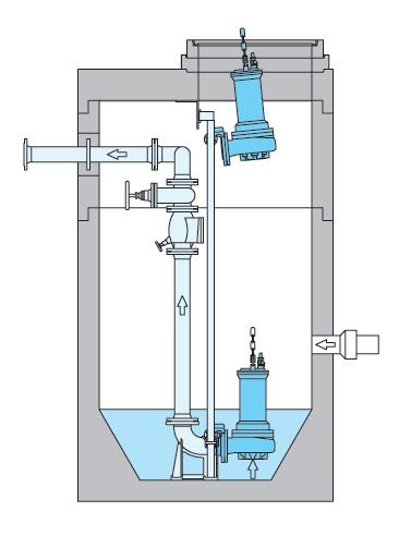 La pompe est installée dans un local séparé de la station de pompage, à l’épreuve des inondations. Raccord à brides pour conduite d‘aspiration et de refoulement.