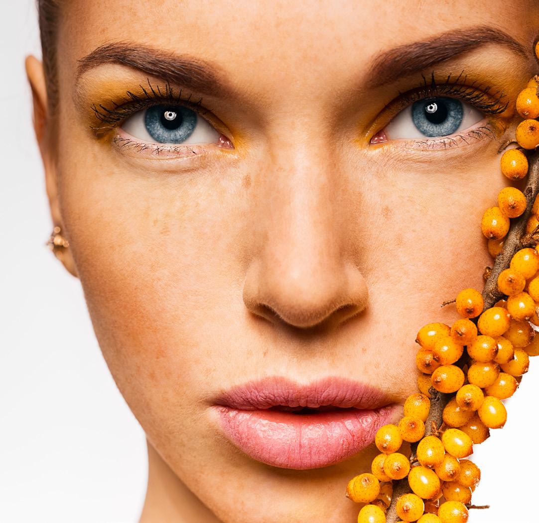 TYRNIMARJA: Tyrni on supermarja ihonhoitoon sen monipuolisen ja raikkaan sisältönsä ansiosta. Siitä saadaan luonnollisessa muodossa A-, C- ja E-vitamiineja, jotka ovat tärkeitä ihon sidekudoksen ja kiinteyden kannalta. Ne estävät myös vapaiden happiradikaalien soluja tuhoavaa vaikutusta. Tämä ehkäisee ihon ikääntymisen merkkejä.Tyrnissä on myös B-ryhmän vitamiineja sekä biotiinia, joka ehkäisee ihoa kuivumasta ja vahvistaa ihoa, mikä on erityisen tärkeää herkälle iholle. Tyrniöljyn rasvahappokoostumus ja sen sisältämät Omega -3, -6, -7, ja -9 -rasvahapot ovatkin tärkeitä hoidettaessa kuivaa ja ärtynyttä ihoa.
