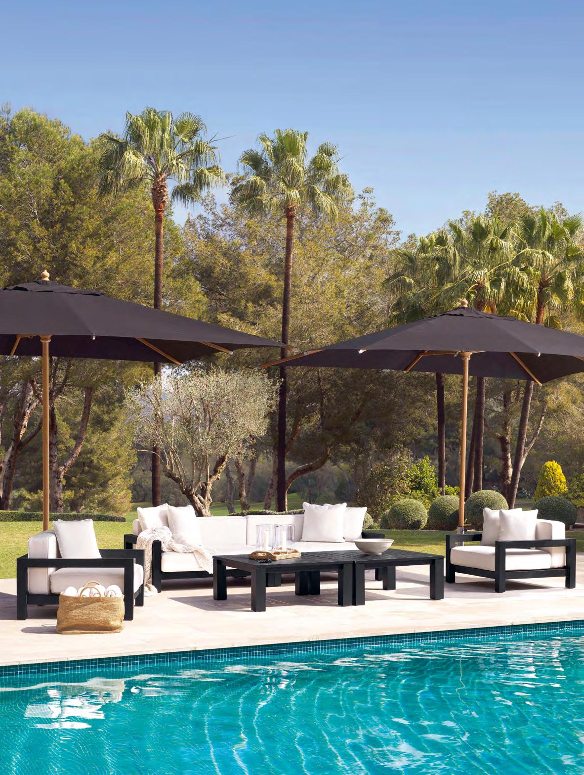 With striking yet simple lines, the CapAntibes collection by Eichholtz brings contemporary elegance to your outdoor space. Expertly crafted from durable aluminium with a black powder-coated finish, the armchair and sofa come with comfortable Sunbrella canvas cushions for lasting luxury. Shown here with Eichholtz’s sleek Vistamar coffee tables. Eichholtz is located in C.C. Azalea near Puerto Banús, or buy online at www.eichholtzmarbella.com