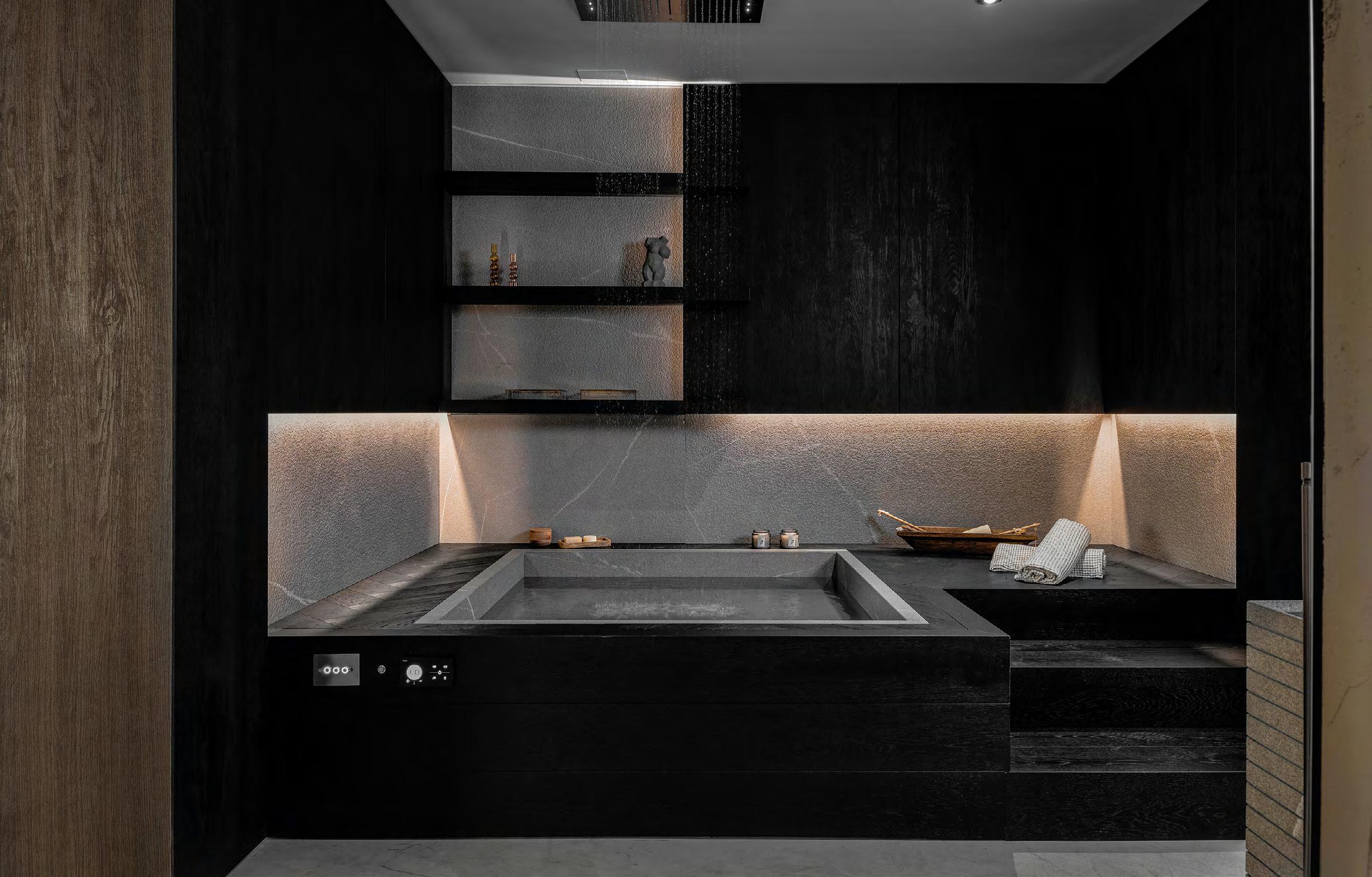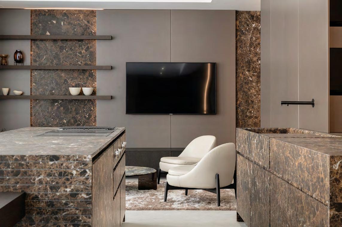flooring in the bathroom adds a personal touch. The Mediterranean outdoor space is equally inviting, with a pool, al fresco bar and cosy fireplace, and the basement incorporates an entertainment area, indoor bar for social gatherings and sophisticated wine bodega. Adding an element of exclusivity to The Nest, Omeo Design also introduces “Secret Spaces” – a cleverly hidden door that seamlessly blends into the wall and reveals a luxurious gym and spa surprise.