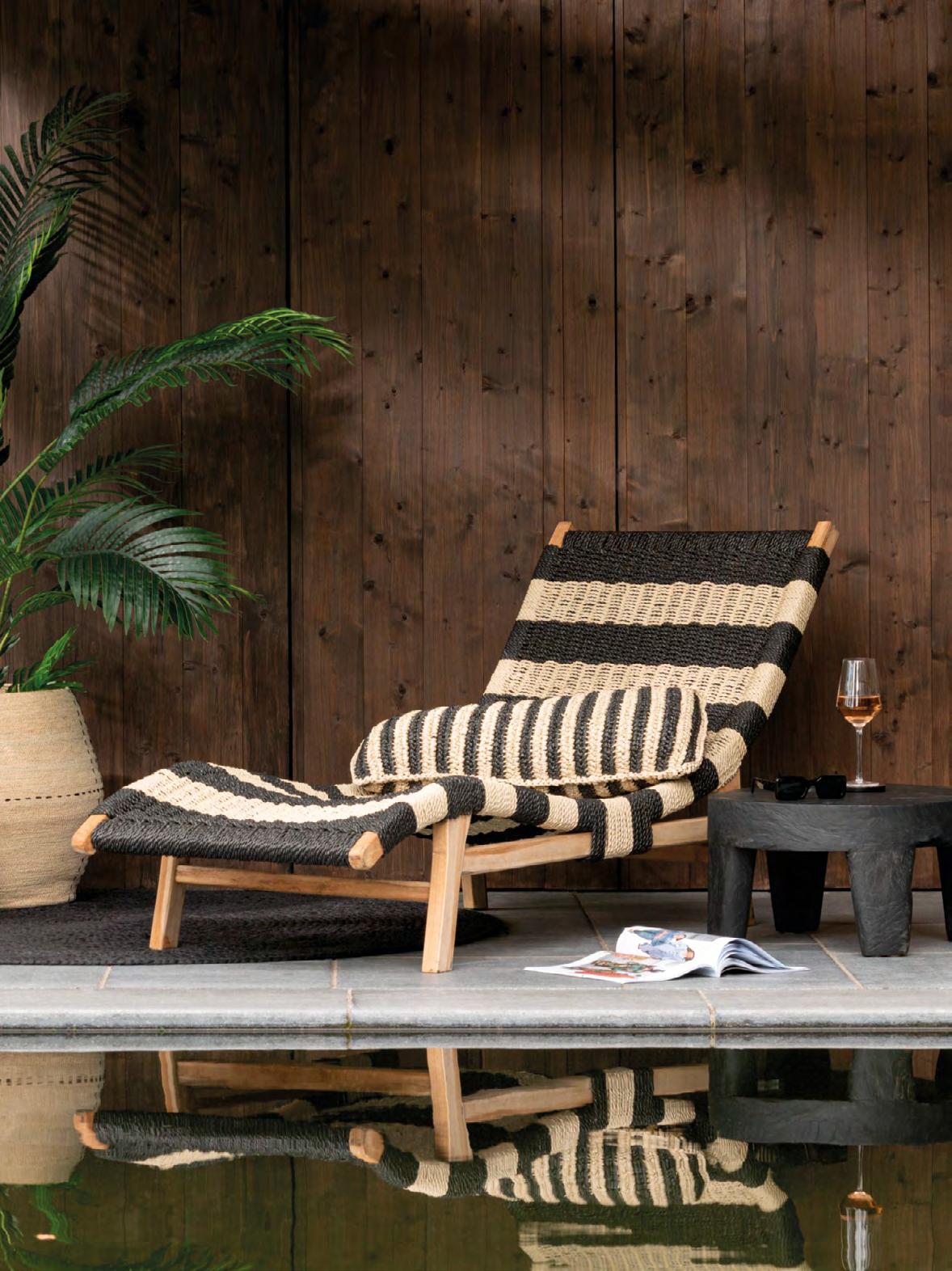 Below Left The Black Lombok sun lounger has a striking striped woven design in earthy warm tones. This comfortable sunbed that exudes natural beauty and unique charm is available from Sybartum on the Mijas Road and in Pol. Ind. San Pedro de Alcántara, or you can buy their products online at www.sybartum.com