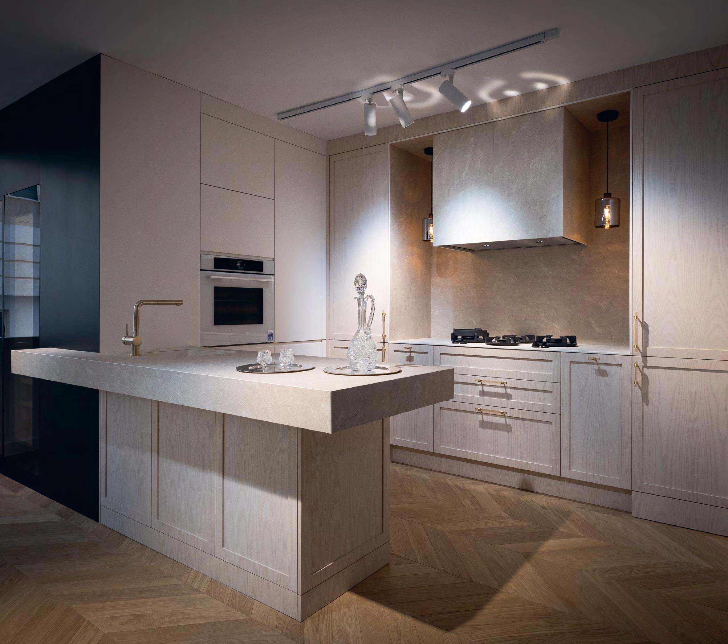 features a more traditional interior design with warmer tones and an emphasis on organic forms and stone materials. The CS Wine restaurant, characterised by its sleek and sophisticated design, showcases the versatility of large-format options in kitchen settings.