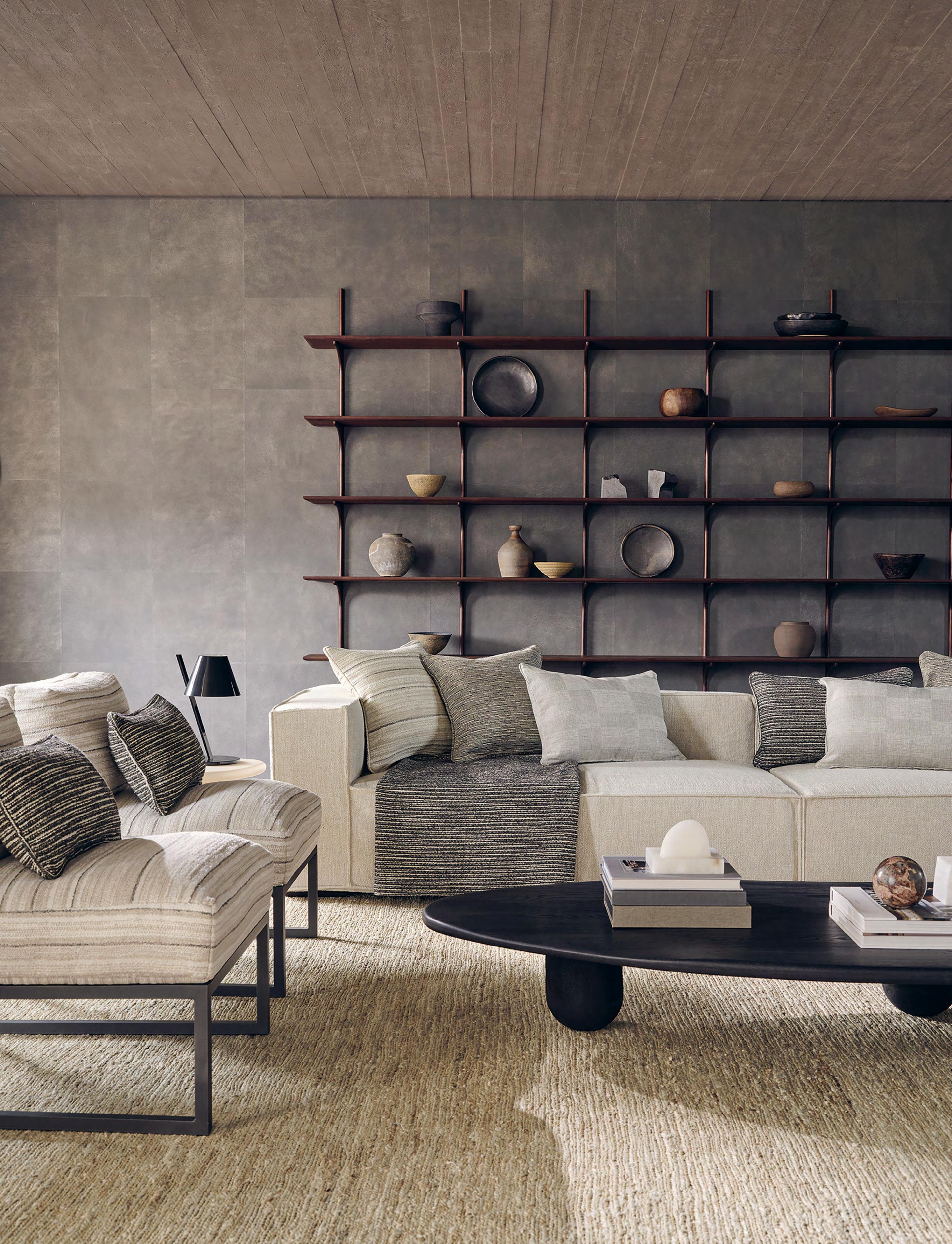 In contrast to the drama, we noticed a huge presence of grounding, tactile forms and a return of earthy minimalism with designers leaning into creamy neutrals, warm woods, natural stones, and soft, touchable textures. American walnut, travertine, and those sculptural three-legged forms aren’t passing trends. They reflect a longing for calm and a deeper connection to our surroundings.