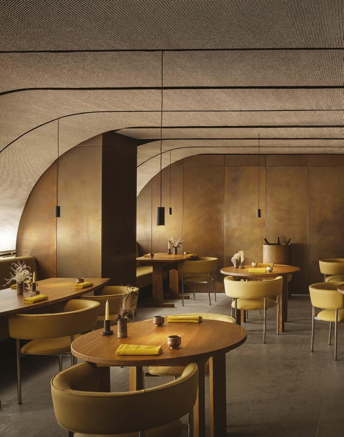 Thus, precious slabs of oxidized copper finished with beeswax cover the interior walls of the dining room, while extra-large slabs of Catalan limestone, flamed and brushed, draw a perfect grid on the floors. Surprisingly, a steel mesh covers the ceilings and walls with soft vaults, acting as a screen for the windows. The ginger leather upholstery of the banquettes, chairs and wall paneling creates a balanced colour contrast with the local oak used for the bespoke tables and built-in furniture. Lastly, brushed stainless steel has been chosen as the coating for the kitchen and the access area that opens onto the dining room. In short, as the Danish architect points out, “Ikoyi is a restaurant full of sensory experiences, where design elements blend perfectly with the craftsmanship and attention to what is served on the plate”. H