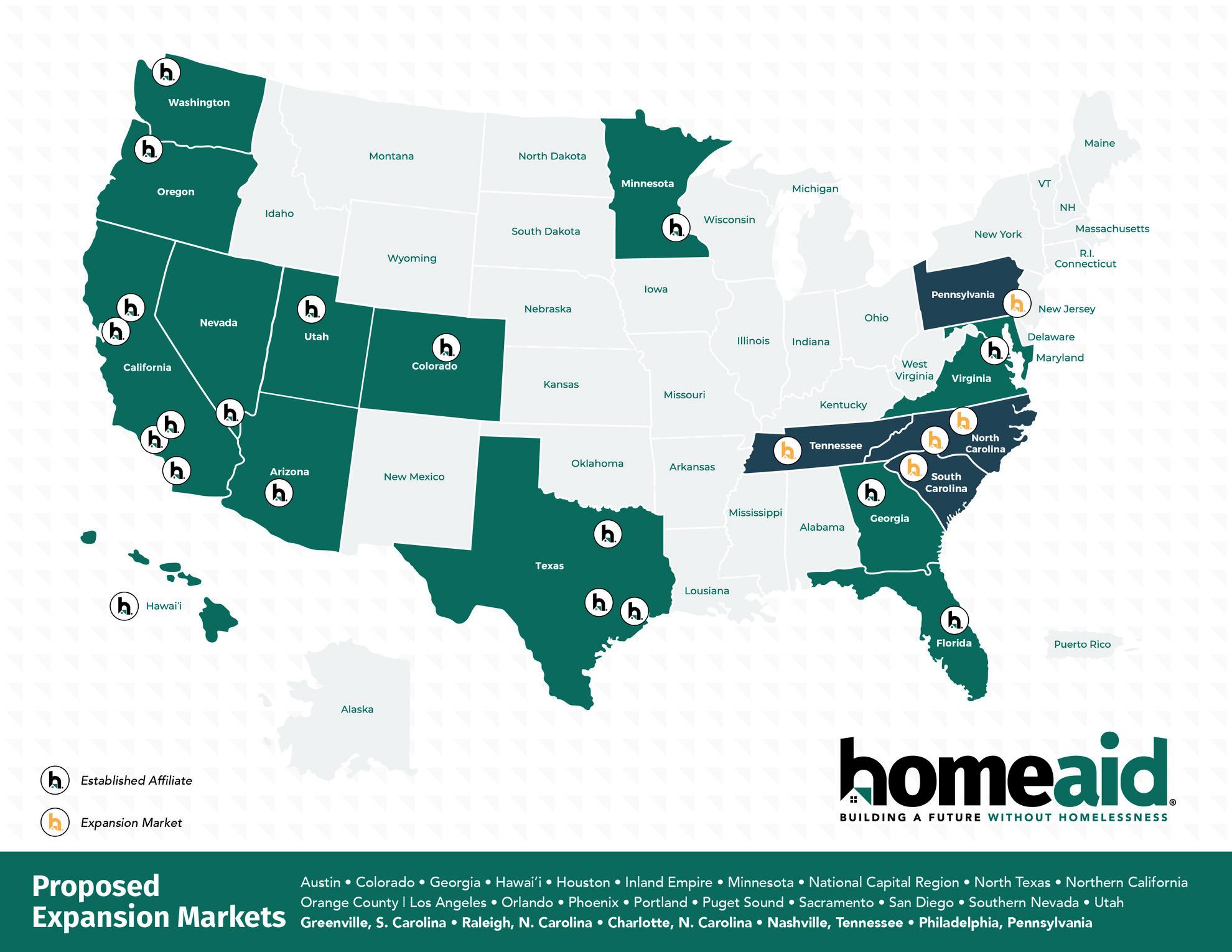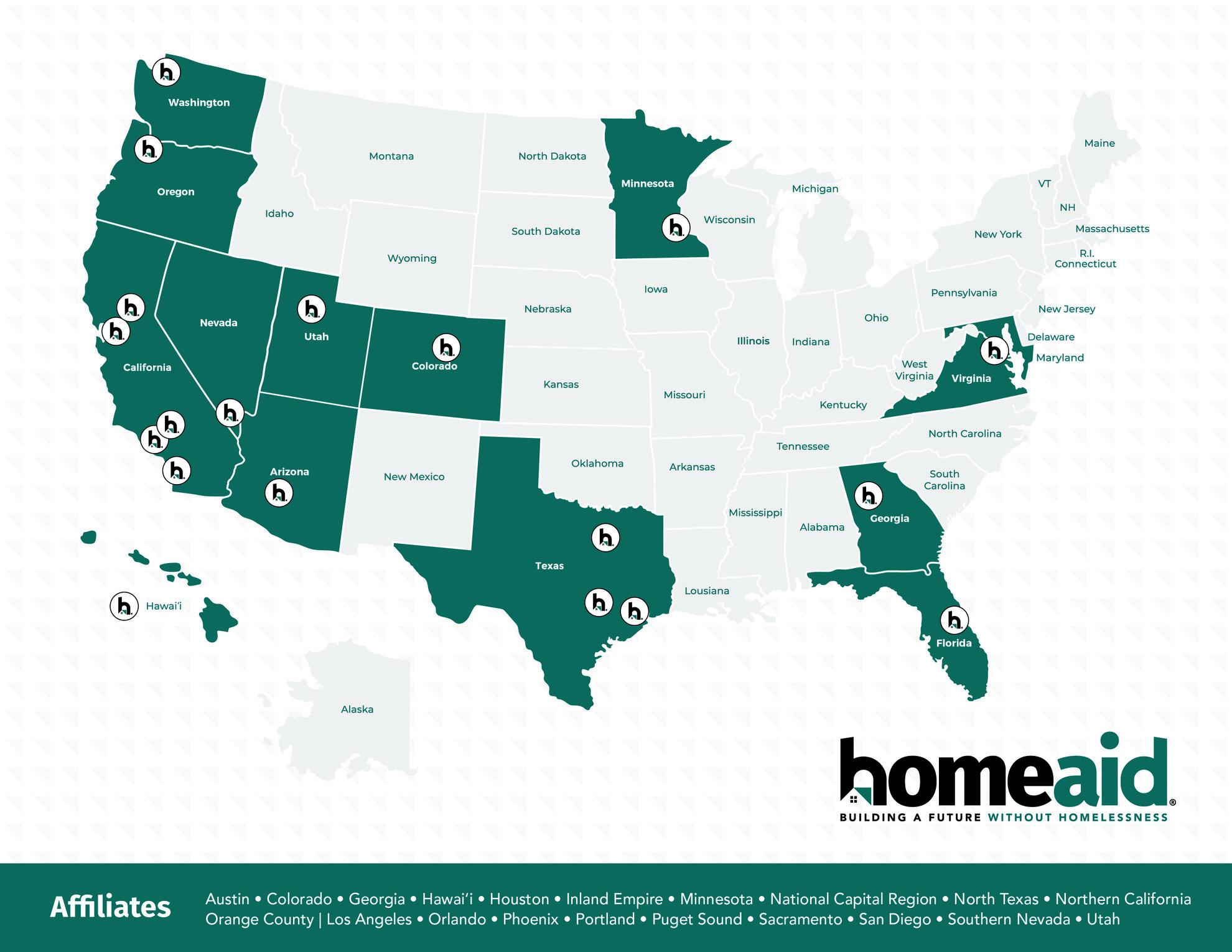 HomeAid’s Chief Expansion Officer seeks to expand the number of affiliates across the United States. In this process, HomeAid assists new affiliates by establishing the affiliate as a 501c3 organization. Once the affiliate is established, the national staff recruits a strong board of directors while establishing relationships with the local non-profit homeless service providers. The national organization assists in raising and matching local funding and hiring the Executive Director. HomeAid’s expansion model focuses on cultivating relationships and conducting market research, and launching an affiliate can take up to two years due to the cultivation and the legalization process that is necessary for its success. Establishing operations while creating a long-term, sustainable, and successful affiliate is always the goal.
