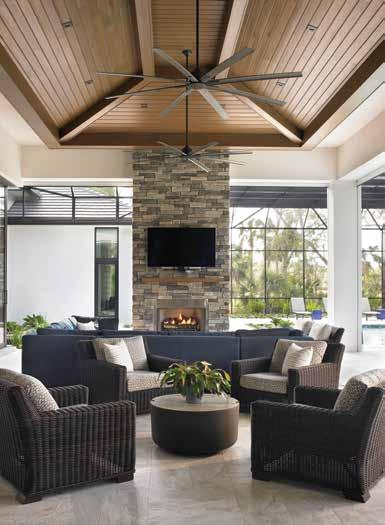 Outdoor Living: Porcelain pavers from Design Works surround the pool and continue into this outdoor living section. The pavers themselves hide fossils, visible with a bit of searching, and the cypress ceiling detail provides the organic feel of wood to the space. “There are a series of focal points that were important,” says Andrea of several features of the outdoor living space, “and make the rear yard area an extension of the home.” The same stacked ledgestone used on the exterior repeats on the outdoor gas fireplace, giving the front and back a pleasant symmetry. A large Century Furniture sectional in slate-blue fabric picks up the blue tones of the stone, and a cluster of tables allows guests to rearrange them easily according to their needs. The side chair’s woven texture adds another organic element, and the entire space flows to the interior through the ninety-degree slider opening.