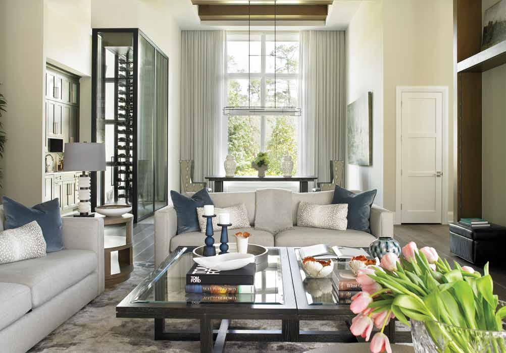 Living Room & Wine Room (Right): The great room prominently features the open concept that the clients admired during their tour of their inspiration home. “This is their main entertaining room, so I maximized seating with very large sofas without making the space too crowded,” McDaniel notes about the forty-two-inch-deep Taylor King sectional. The see-through wine room, from Royston Architectural Elements, features floor-to-ceiling bottle racking and neatly fills a narrow blank space on the original floor plan across from the butler’s pantry.
