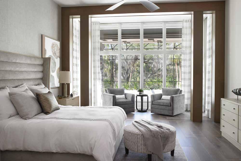 Primary Bedroom: The primary bedroom features a walnut-toned room divider to separate the sleeping space from the sitting area. “The wall detail wasn’t on the plan,” notes McDaniel, “but my client wanted the alcove to be more of a separate space. The extra columns on the divider frame the window, so the eye is drawn right to the woods and pool outside.” The divider also conceals the lower ceiling necessary to house the window coverings.