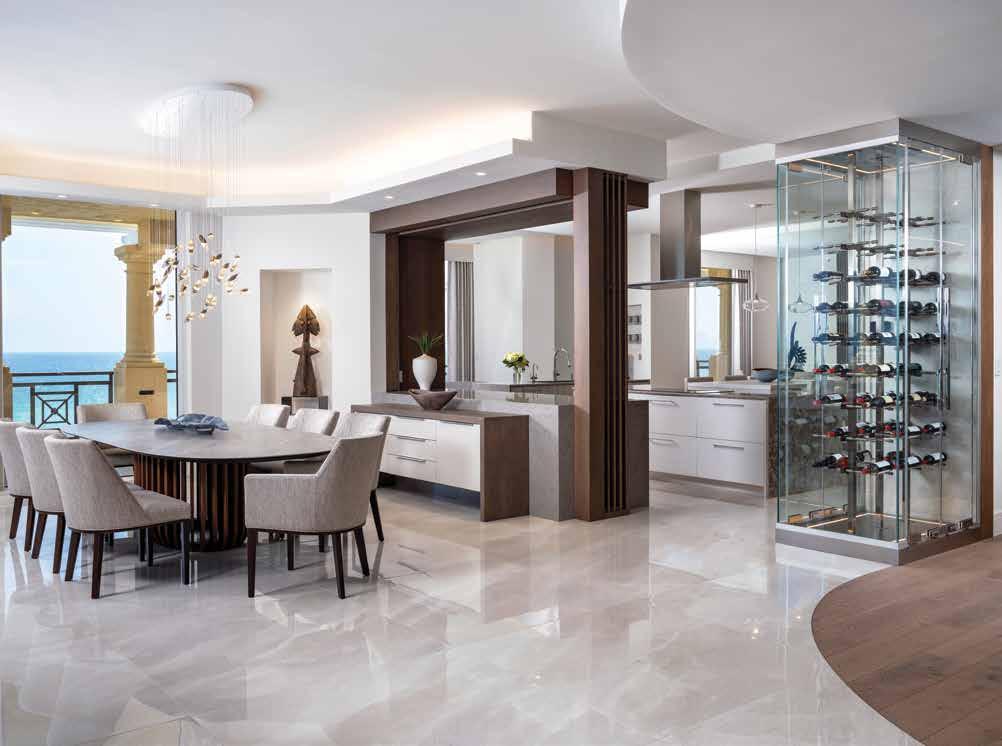 Dining Room: The pass-through from the kitchen to the dining room repeats the wooden architectural styling of the structural pillar. It includes recessed lighting so appetizers or drinks can be beautifully lit. Even the dining table from Modern Loft mimics the wood slat design. It’s surrounded by chairs from A. Rudin, and a custom console offers even more buffet space for entertaining. The glass refrigerated wine storage unit proved a challenge for the builder. “This project gave us a chance to showcase our ability to work with unique projects,” Frieler says. “One such element was the wine room. This element was especially tricky and required not only a specialist to be involved, but it also required a lot of creative thinking on our part to make it a reality.”